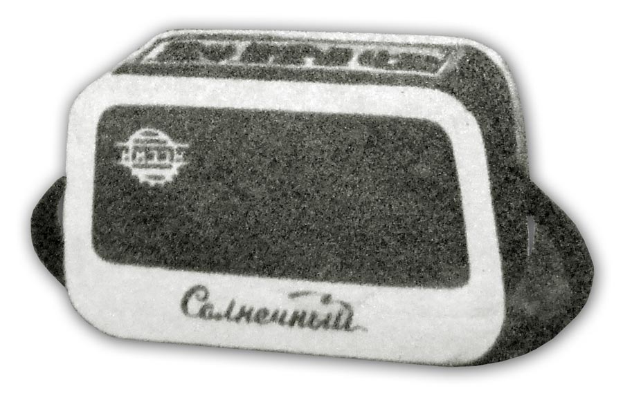 Переносной транзисторный радиоприёмник *Солнечный* в начале 1959 года разработан Ленинградским НИИРПА им. Попова. Особенность приёмника - это питание от малогабаритной солнечной батареи встроенной в верхнюю часть корпуса совместно со встроенным аккумулятором. При выключенном приёмнике происходила подзарядка аккумулятора от солнечной батареи при обычном дневном освещении, этого вполне хватало на нормальную работу радиоприёмника в течении 3 часов в сутки. При необходимости длительного прослушивания надо было направлять на солнечную батарею свет солнца или лампы в 60...100 Вт. Приёмник собран на 8 транзисторах. Диапазон СВ. При работе с ферритовой антенной чувствительность приёмника 5 мВ/м. Избирательность по соседнему каналу 12 дБ. Номинальная выходная мощность усилителя 25 мВт. Диапазон частот по звуковому давлению 300...4000 Гц. Габариты радиоприёмника 240х105х68 мм. Вес 650 гр. Радиоприёмник был изготовлен в опытном экземпляре. Корпус выпонен из бумажной массы.