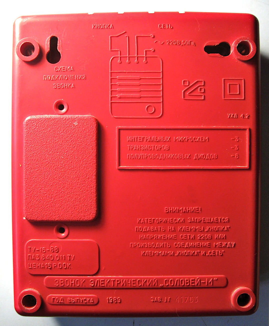 Звонок электрический Соловей-М предназначен для подачи звуковых сигналов в жилых помещениях. Звонок приближенно имитирует пение соловья. Звонок электрический бытовой *Соловей-М* выпускался с 1989 года Смоленским ПО *Искра*. Подробное описание звонка *Соловей-М* в его инструкции.