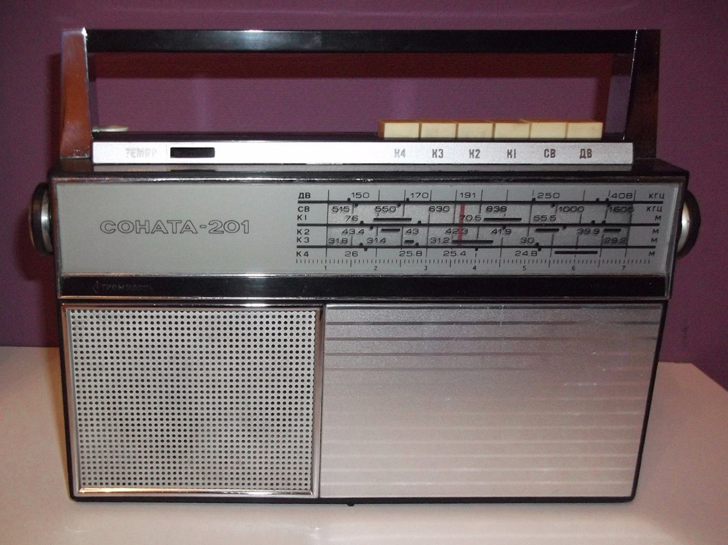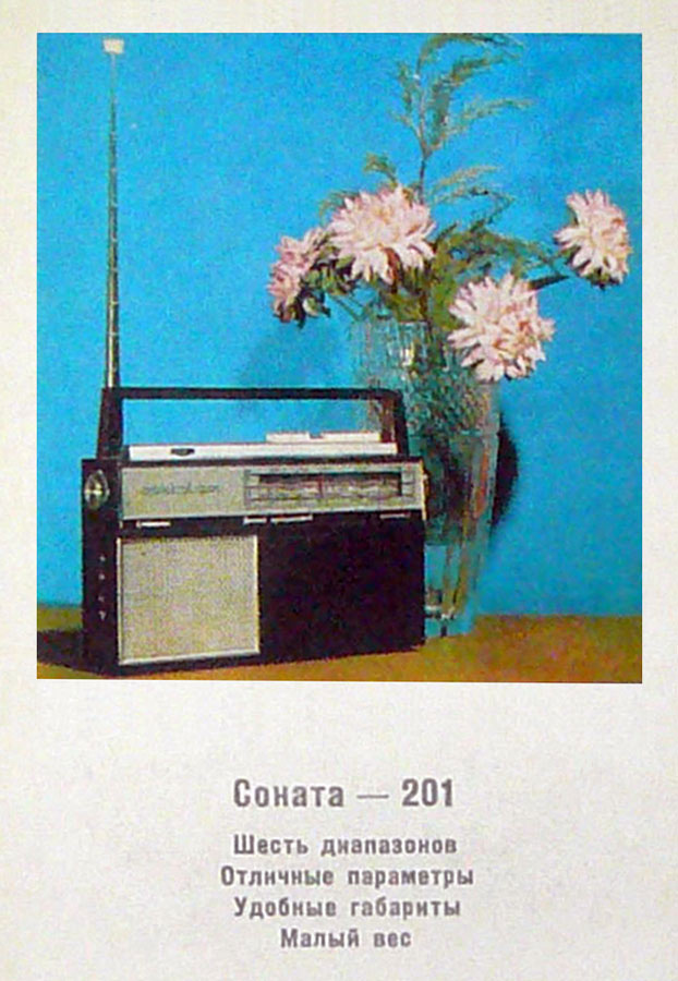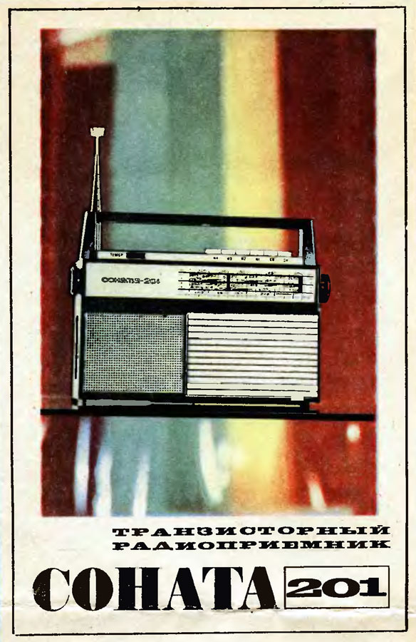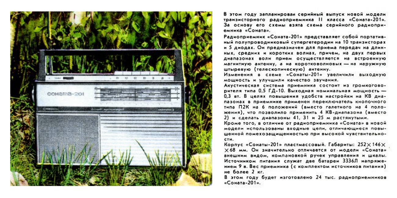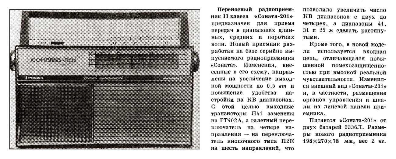 Портативный радиоприёмник *Соната-201* с 1972 года выпускал Ленинградский завод *Радиоприбор*. Радиоприёмник 2-го класса **Соната-201** предназначен для приёма программ радиовещательных станций в диапазонах ДВ, СВ и четырёх поддиапазонах КВ. Он разработан на основе приёмника **Соната**. Изменения в электрической схеме направлены на увеличение выходной мощности до 0,5 Вт и удобству настройки на KB поддиапазонах. Для этого выходные триоды П41 заменены на ГТ402А, а галетный переключатель заменён новым кнопочным переключателем на шесть положений. Это нововведение позволило увеличить число KB поддиапазонов с двух до четырёх, а поддиапазоны 41, 31 и 25 метров сделать растянутыми. Кроме того в модели используется входная цепь отличающаяся помехозащищенностью и высокой чувствительностью. Изменился и внешний радиоприёмника, а также размещение его органов управления и шкалы. Питание осуществляется от 2-х батарей 3336Л. Размеры радиоприёмника - 198 х 270 х 78 мм. Масса 2 кг. Экспортный вариант радиоприёмника имел КВ поддиапазоны с 16 до 50 метров.