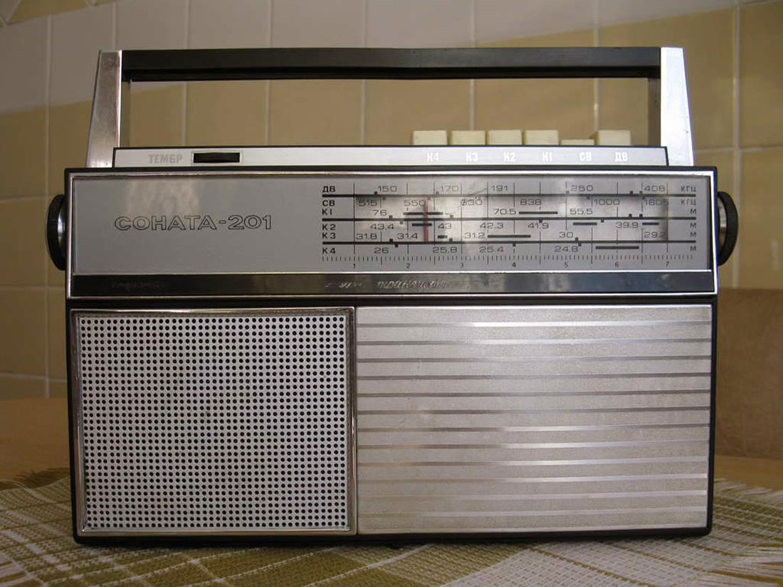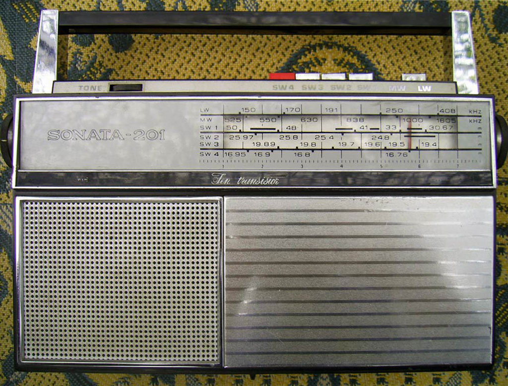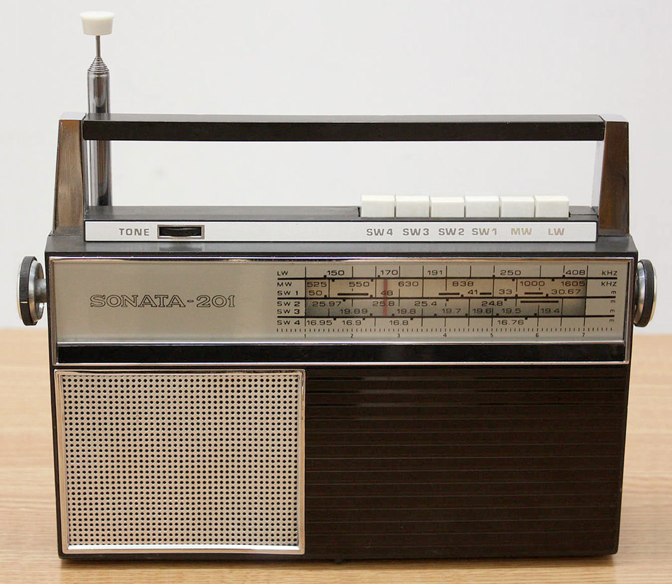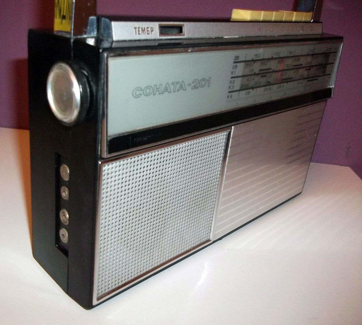 Портативный радиоприёмник *Соната-201* с 1972 года выпускал Ленинградский завод *Радиоприбор*. Радиоприёмник 2-го класса **Соната-201** предназначен для приёма программ радиовещательных станций в диапазонах ДВ, СВ и четырёх поддиапазонах КВ. Он разработан на основе приёмника **Соната**. Изменения в электрической схеме направлены на увеличение выходной мощности до 0,5 Вт и удобству настройки на KB поддиапазонах. Для этого выходные триоды П41 заменены на ГТ402А, а галетный переключатель заменён новым кнопочным переключателем на шесть положений. Это нововведение позволило увеличить число KB поддиапазонов с двух до четырёх, а поддиапазоны 41, 31 и 25 метров сделать растянутыми. Кроме того в модели используется входная цепь отличающаяся помехозащищенностью и высокой чувствительностью. Изменился и внешний радиоприёмника, а также размещение его органов управления и шкалы. Питание осуществляется от 2-х батарей 3336Л. Размеры радиоприёмника - 198 х 270 х 78 мм. Масса 2 кг. Экспортный вариант радиоприёмника имел КВ поддиапазоны с 16 до 50 метров.