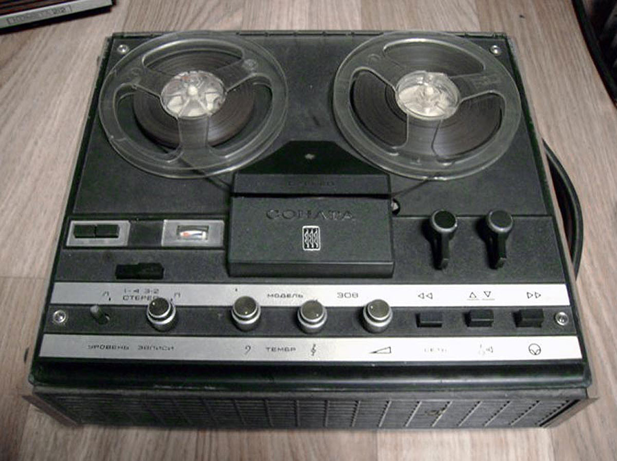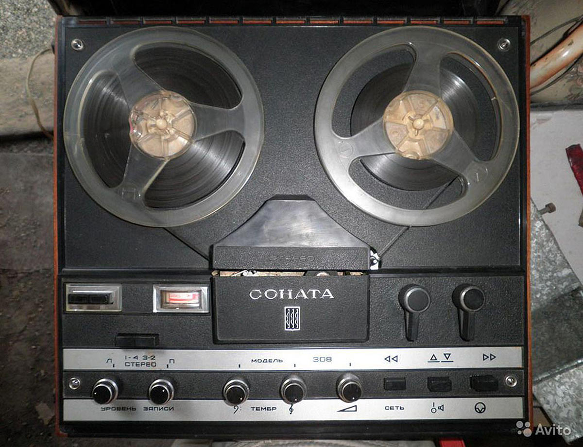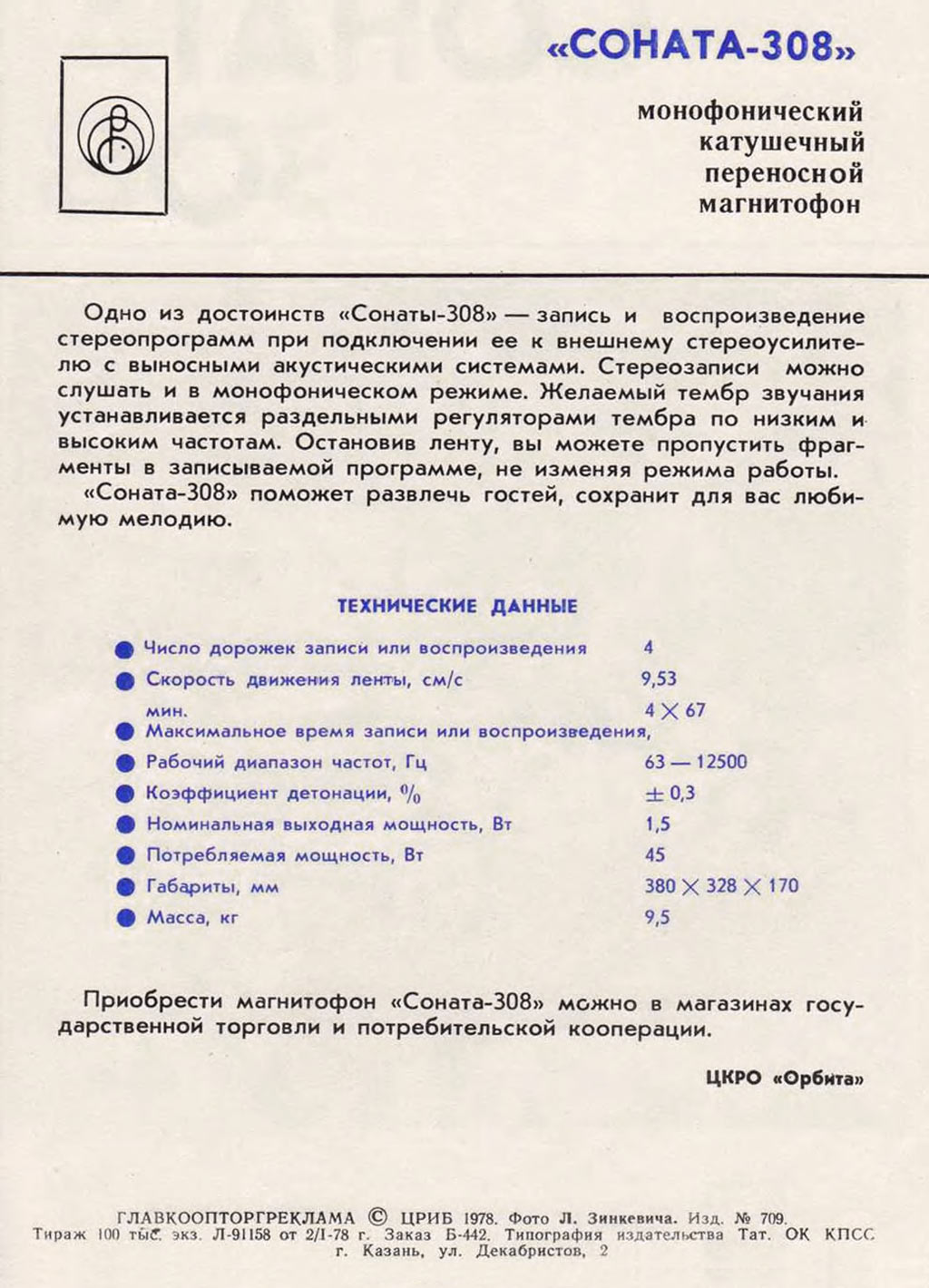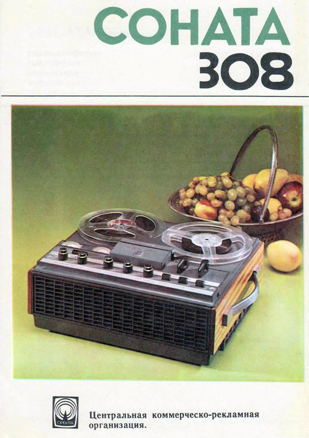 Катушечный магнитофон *Соната-308* с начала 1977 года выпускало Великолукское ПО *Радиоприбор*. Магнитофон **Соната-308** отличается от модели **Соната-304** тем, что новый магнитофон четырёхдорожечный и до линейного выхода стереофонический. Магнитофон планировали выпускать в оформлении старой модели (1-е фото). Аппарат предназначен для записи моно и стерео-фонограмм, моно записи можно слушать через встроенные громкоговорители или внешние АС, а стерео через стереотелефоны и подключаемый к ЛВ внешний стереоусилитель с АС. В магнитофоне имеются регуляторы тембров, два стрелочных индикатора уровня записи, впоследствии только один подключаемый поочерёдно к одному из каналов. Тип магнитной ленты А4407-6Б, А4409-6Б, А4309-6Б. Скорость ленты 9,53 см/с. Время записи на катушках №15 4х65 минут. Коэффициент детонации ±0,3 %. Диапазон рабочих частот 63...12500 Гц. Номинальная выходная мощность 1 Вт. Диапазон регулировки тембра по ВЧ ±10 дБ, по НЧ ±5 дБ. Уровень помех в канале З/В -42 и -45 дБ. Потребляемая мощность 45 Вт. Габариты МГ - 380х328х170 мм. Вес 9,5 кг.