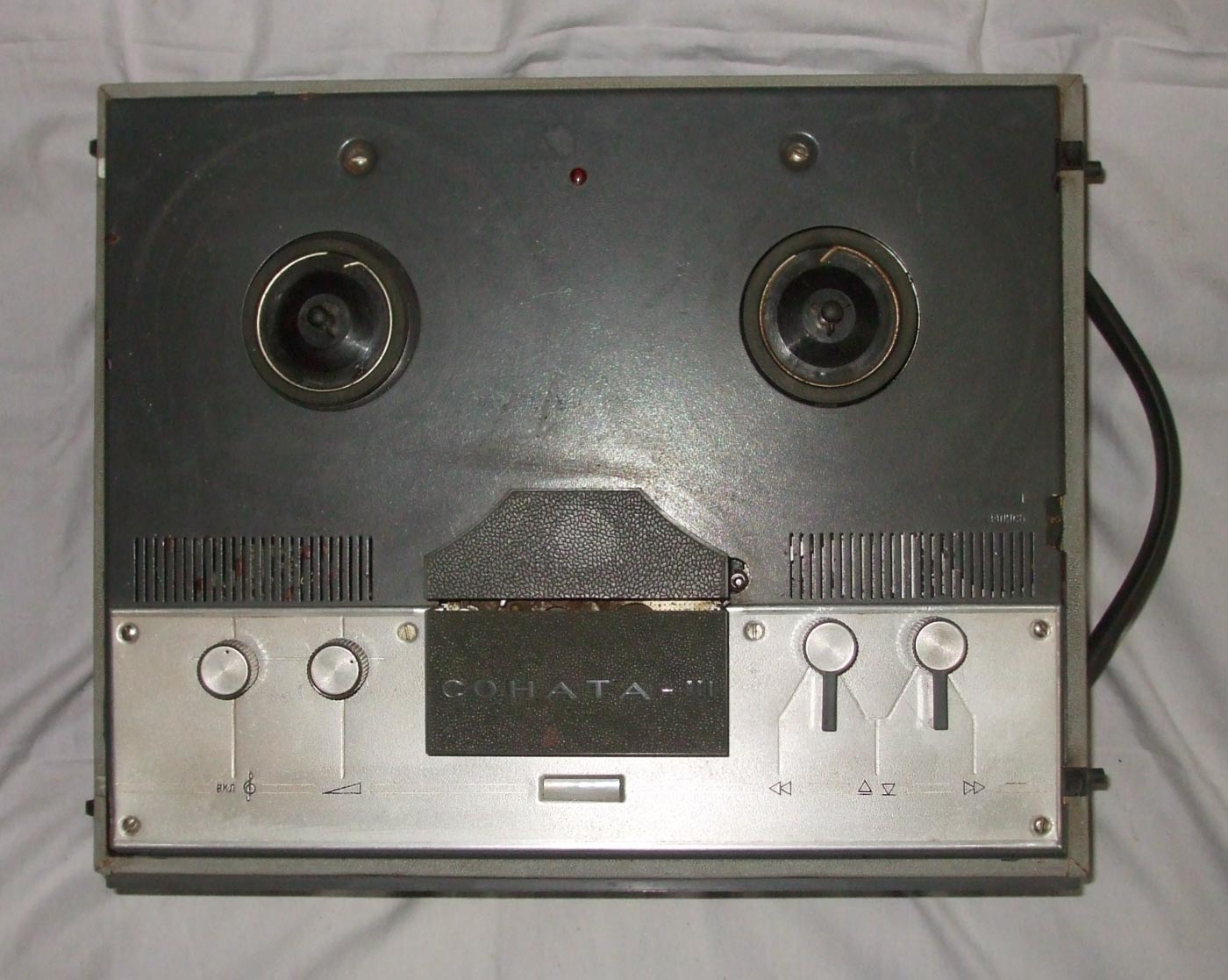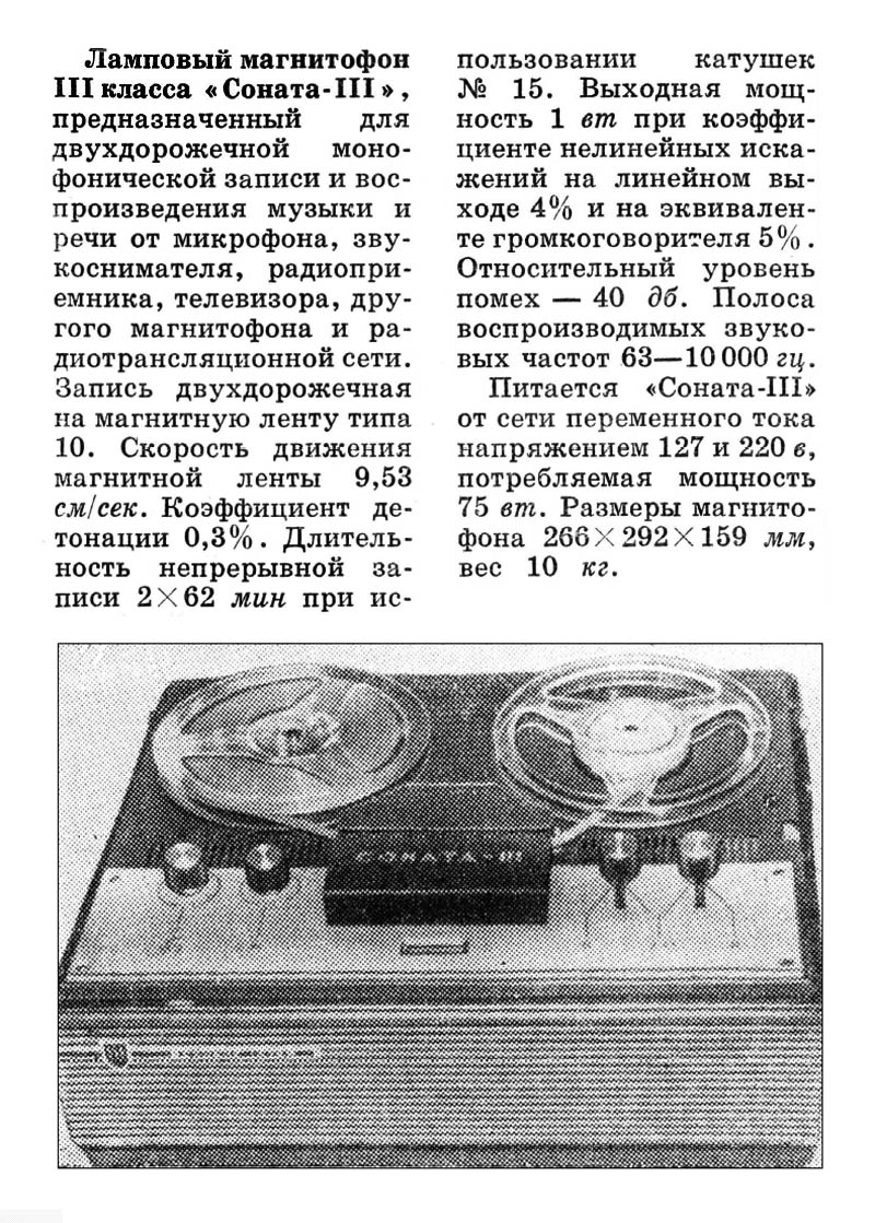 Катушечный магнитофон *Соната-III* с 1971 года выпускал Великолукский радиозавод. Ламповый магнитофон 3-го класса **Соната-III** разработан на основе ЛПМ магнитофона **Чайка-66**. Магнитофон рассчитан на двухдорожечную запись от любых источников звукового сигнала. Скорость магнитной ленты 9,53 см/сек. Коэффициент детонации 0,3%. Запись производится на магнитную ленту типа 6 или 10. Длительность записи при использовании катушек на 375 м. магнитной ленты 65х2 мин. Частота генератора стирания и подмагничивания 60 кГц. Выходная мощность усилителя низкой частоты 1 Вт, при КНИ не более 5%. Напряжение на линейном выходе 0,25...0,5 В. Диапазон частот на линейном выходе 63...10000 Гц. Имеется регулировка тембра по высоким частотам. Питание осуществляется от сети переменного тока 127 или 220 В. Потребляемая мощность 75 Вт. Размеры магнитофона 379х303х164 мм. Масса 9,5 кг.