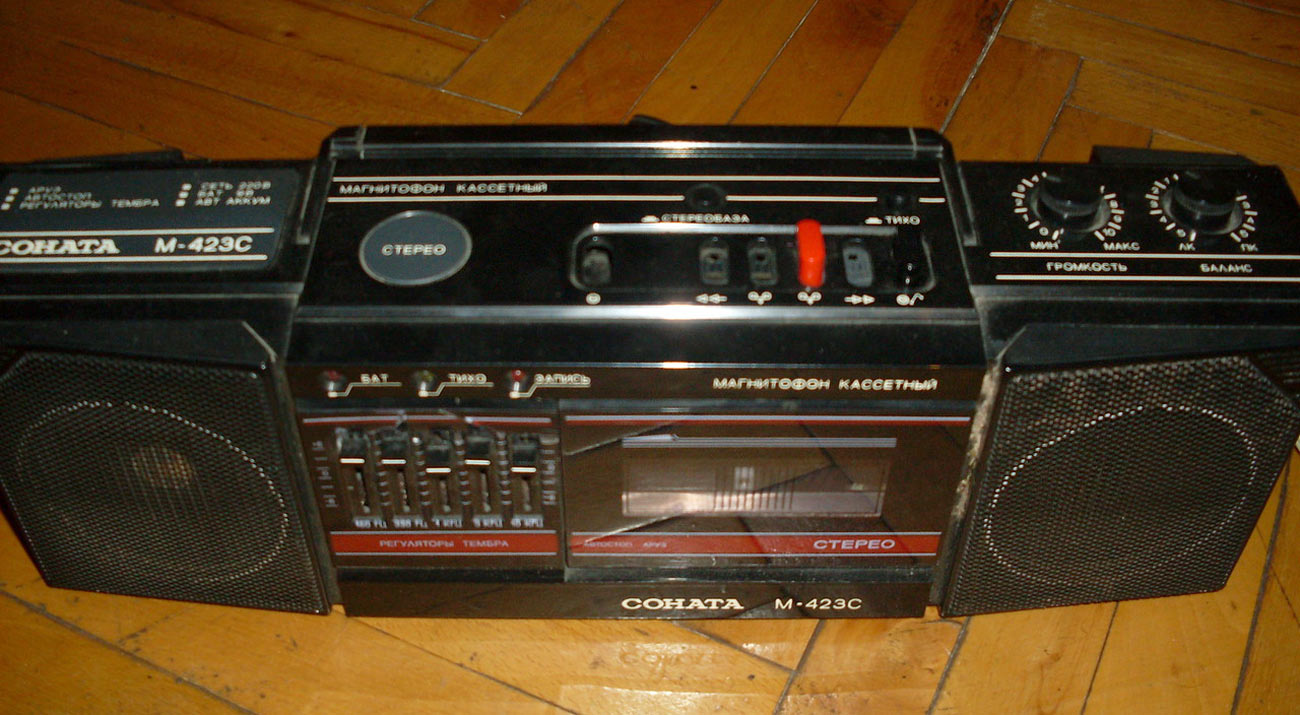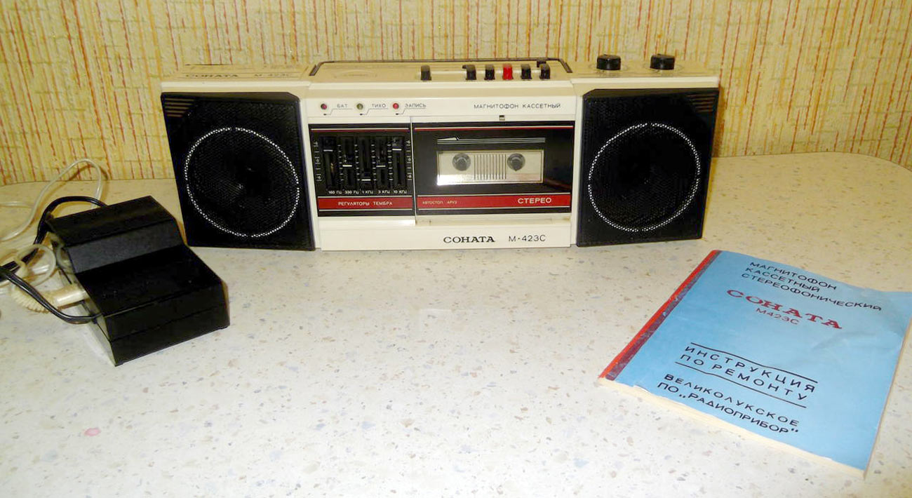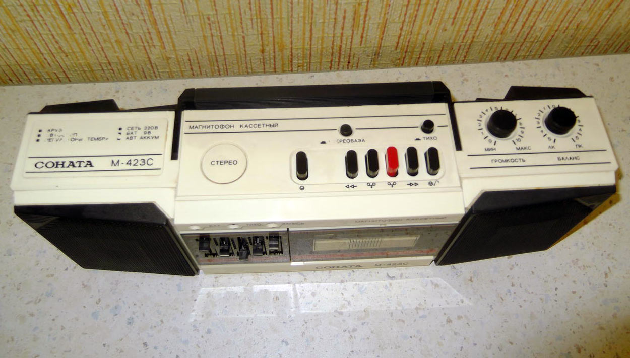 Стереофонический магнитофон *Соната М-423С* с начала 1987 года выпускало Великолукское ПО *Радиоприбор*. Портативный кассетный магнитофон *Соната М-423С* предназначен для записи фонограмм с двух встроенных электретных микрофонов в режиме стерео или внешних источников моно или стереофонического сигнала. Встроенный 5-полосный графический эквалайзер позволяет установить наилучшее качество воспроизведения. Номинальная выходная мощность 2х0,5 Вт, максимальная 2х1,8 Вт. Диапазон рабочих частот на ЛВ - 63...10000 Гц. Габариты магнитофона - 530х180х150 мм. Масса 5 кг.