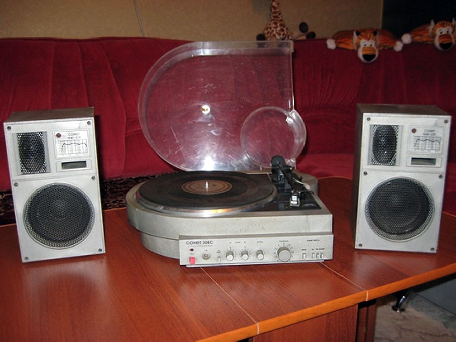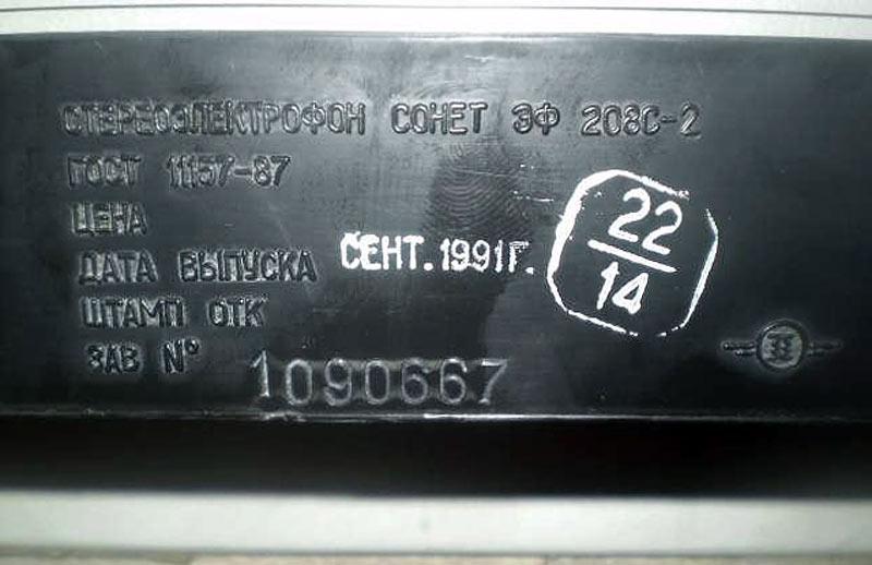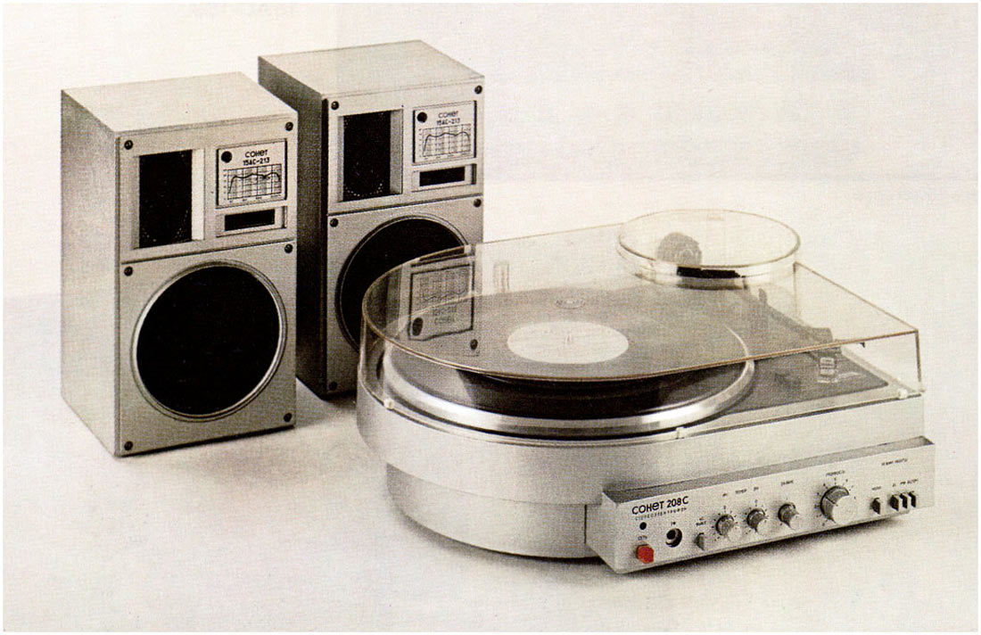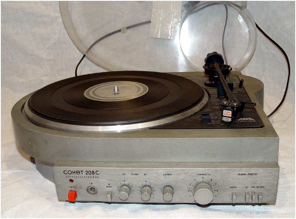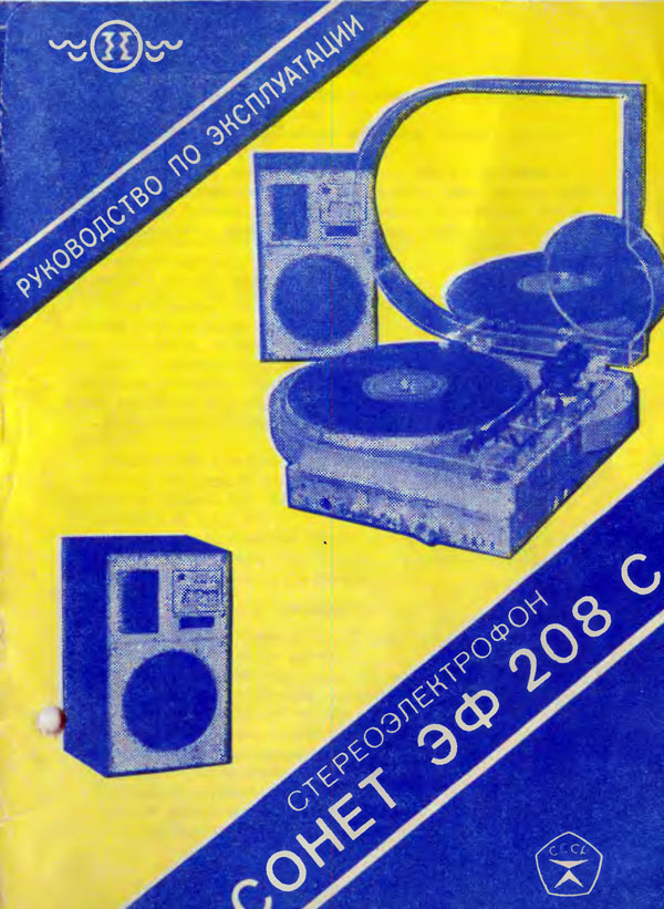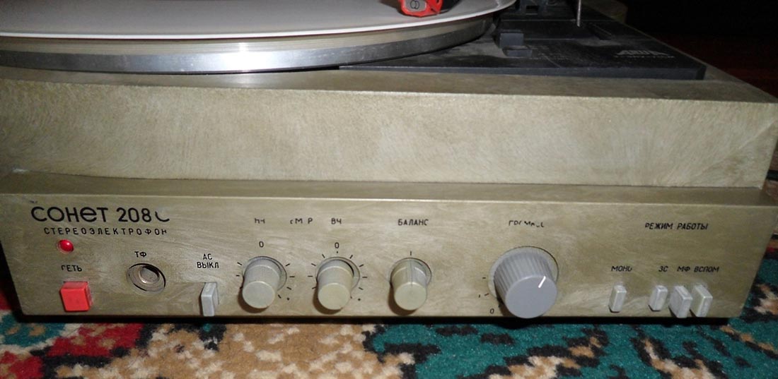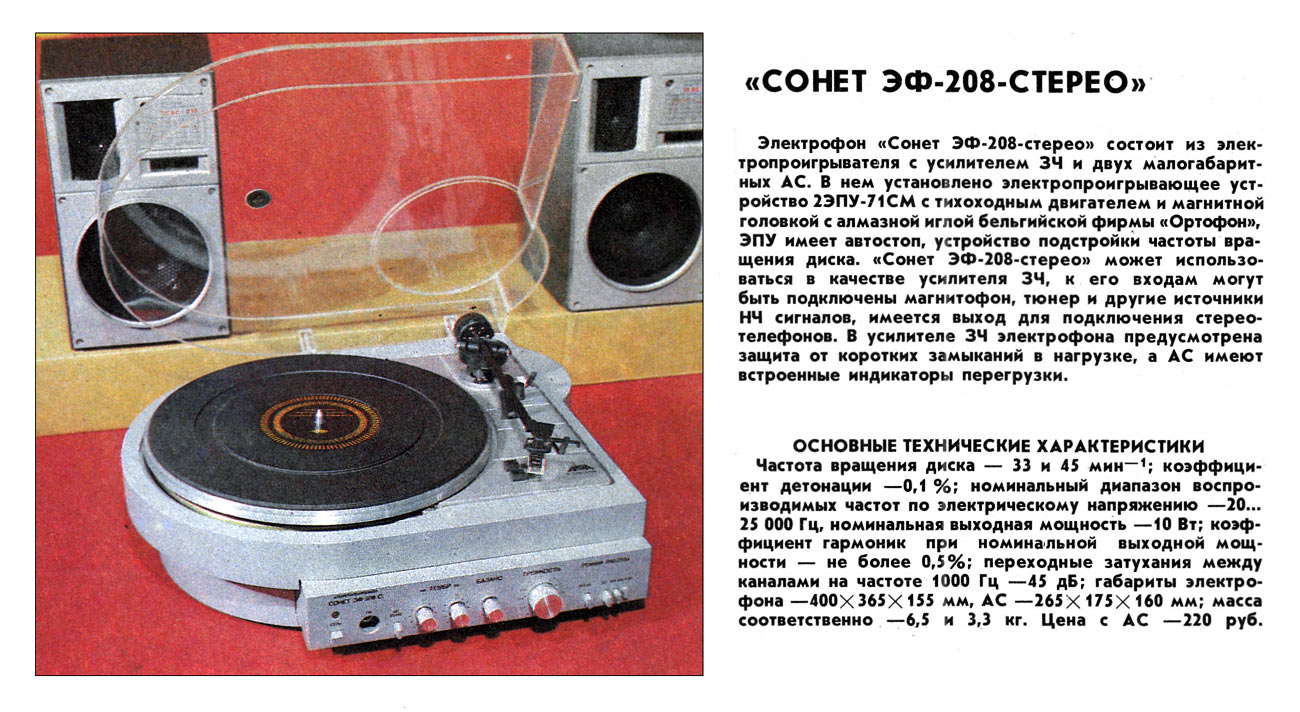 Электрофон сетевой транзисторный *Сонет-208-стерео* с осени 1986 года выпускал Казанский электротехнический завод. Стереофонический электрофон **Сонет-208-стерео** состоит из электропроигрывателя с усилителем звуковой частоты и 2-х малогабаритных акустических систем. В модели установлено ЭПУ типа 2-ЭПУ-71С с тихоходным двигателем и магнитной головкой с алмазной иглой бельгийской фирмы Ортофон. В ЭПУ имеется автостоп, устройство для подстройки частоты вращения диска. Электрофон может использоваться и как УЗЧ, к его входам могут быть подключены источники звуковых сигналов, имеется гнездо стереотелефонов. В УЗЧ аппарата имеется защита от КЗ в нагрузке, АС имеют встроенные индикаторы перегрузки. Скорости вращения диска 33, 45 об/мин. Коэффициент детонации 0,1%. Номинальный диапазон рабочих частот по напряжению 20...25000 Гц, звуковому давлению 63..16000 Гц. КНИ 0,5%. Переходные затухания между каналами 45 дБ. Габариты модели - 400х365х155 мм. АС - 265х175х160 мм. Масса 6,5 и 3,3 кг. Цена с АС 220 рублей. С 1988 года выпускался электрофон *Сонет ЭФ-208С*. В 1990 году электрофон был модернизирован и выпускался с наименованием *Сонет ЭФ-208С-2*. Основные отличия этой модели от 208 - это другое оформление, электронное переключения режимов входов и режима моно/стерео, отсутствие кнопки отключения АС. АС автоматически отключалась при подключении головных телефонов. Усилитель мощности собран на транзисторах или на 2-х микросхемах типа TDA-2030.
