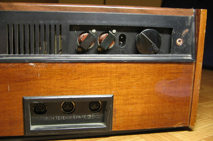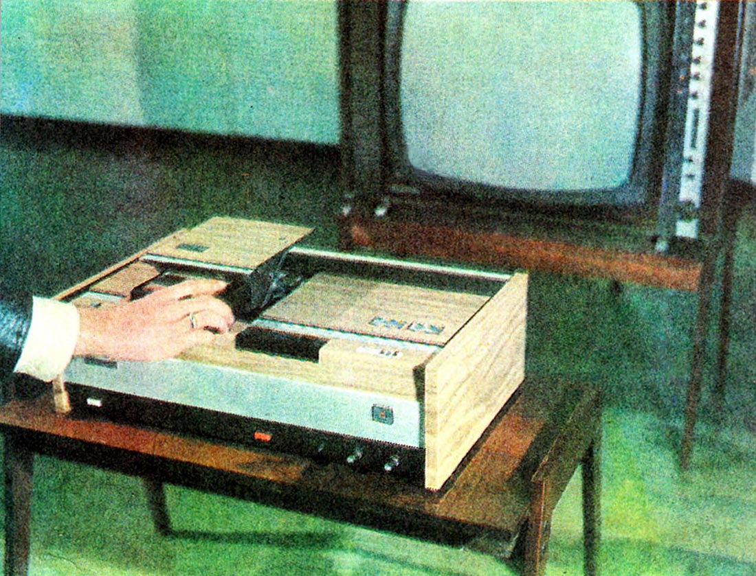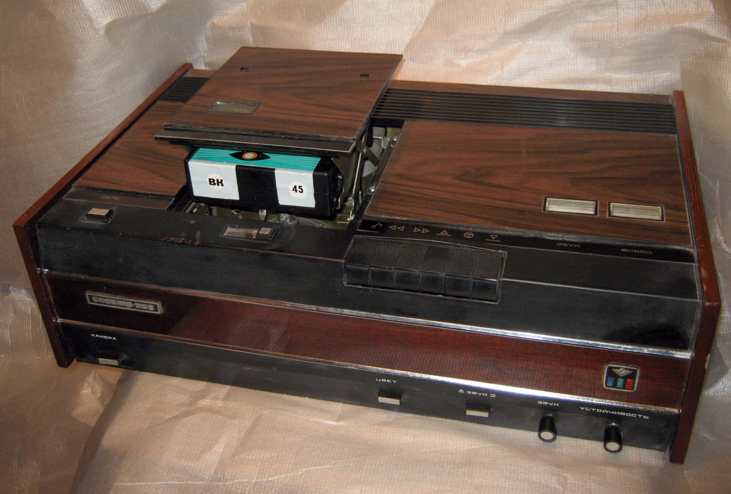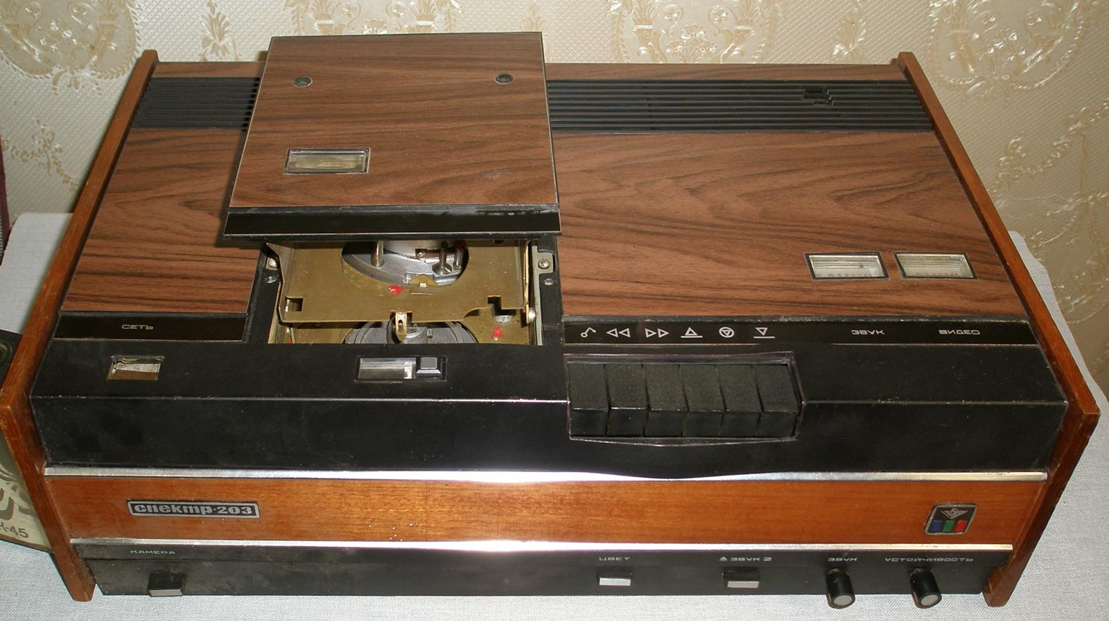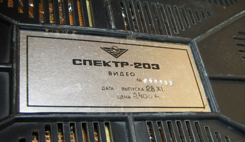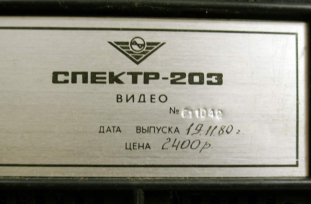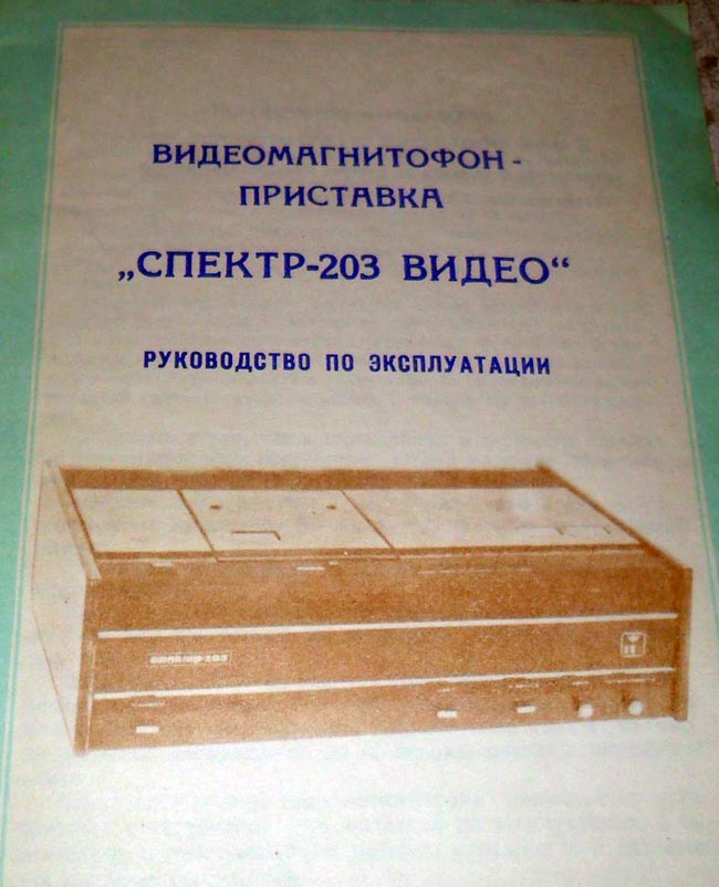 Кассетный цветной видеомагнитофон-приставка *Спектр-203* с 1977 года выпускался Львовским ПТО имени В.И. Ленина. Первый в стране кассетный цветной видеомагнитофон-приставка **Спектр-203-видео** разработан ещё в 1974 году, однако его серийное производство началось лишь в 1977 году. ВМ предназначен для записи и воспроизведения цветных и ч/б телевизионных программ, с использованием телевизоров оборудованных устройством сопряжения, входящим в комплект и с телекамер. В ВМ используется наклонно-строчный способ записи видеоинформации 2-мя вращающимися видеоголовками и продольный способ для записи звукового сопровождения и управляющих сигналов. Носителем информации служит магнитная лента шириной 12,7 мм, помещенная в специальную кассету ВК-30 или ВК-45, время записи на которых соответственно 30 и 45 минут. Заправка ленты в тракт ЛПМ, включение и выключение ВМ в начале и конце магнитной ленты автоматическое. Скорость движения магнитной ленты 14,29 см/с. Коэффициент детонации ЛПМ - 0,25%. Скорость записи видеоинформации 8,1 м/сек. Полоса записываемых видеочастот - 2,2 МГц. Чёткость изображения 200 линий. Диапазон частот канала звука - 120...12500 Гц. Отношение сигнал/помеха в канале звука - 37 дБ. Коэффициент искажений канала звука - 5%. Потребляемая от сети мощность 180 Вт. Габариты ВМ - 560х355х167 мм. Вес 17 кг.