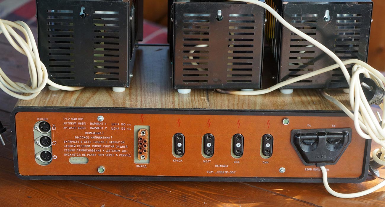 Установка цветомузыкальная *Спектр-301* выпускалась с 1987 года Минским заводом *Калибр*. Установка выпускалась в 2-х вариантах по типам фонарей и рассчитана на совместную работу с магнитофоном, электрофоном, р-приёмником, трансляционной линией и электромузыкальными инструментами. Количество цветовых каналов - 4. Границы диапазонов частот цветовых каналов, красного нижняя 20, верхняя 350 Гц, жёлтого нижняя 150, верхняя 1400 Гц, зелёного нижняя 500, верхняя 2000 Гц, синего нижняя 1200, верхняя, 20000 Гц. Чувствительность входа приёмника 10, электрофона 150, трансляционной линии 10000 мВ. Время непрерывной работы 8 часов. Напряжение питания 220 В. Потребляемая мощность с экраном 500, с прожекторами 450 В/А. Мощность прожекторов по каждому цветовому каналу 100 В/А.