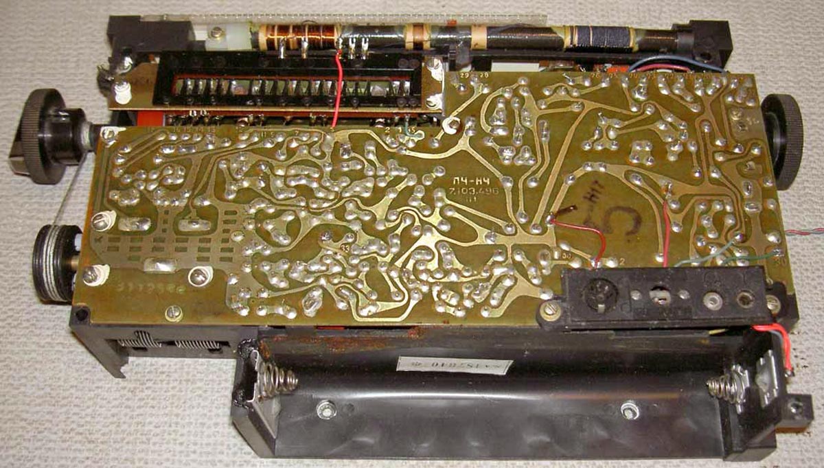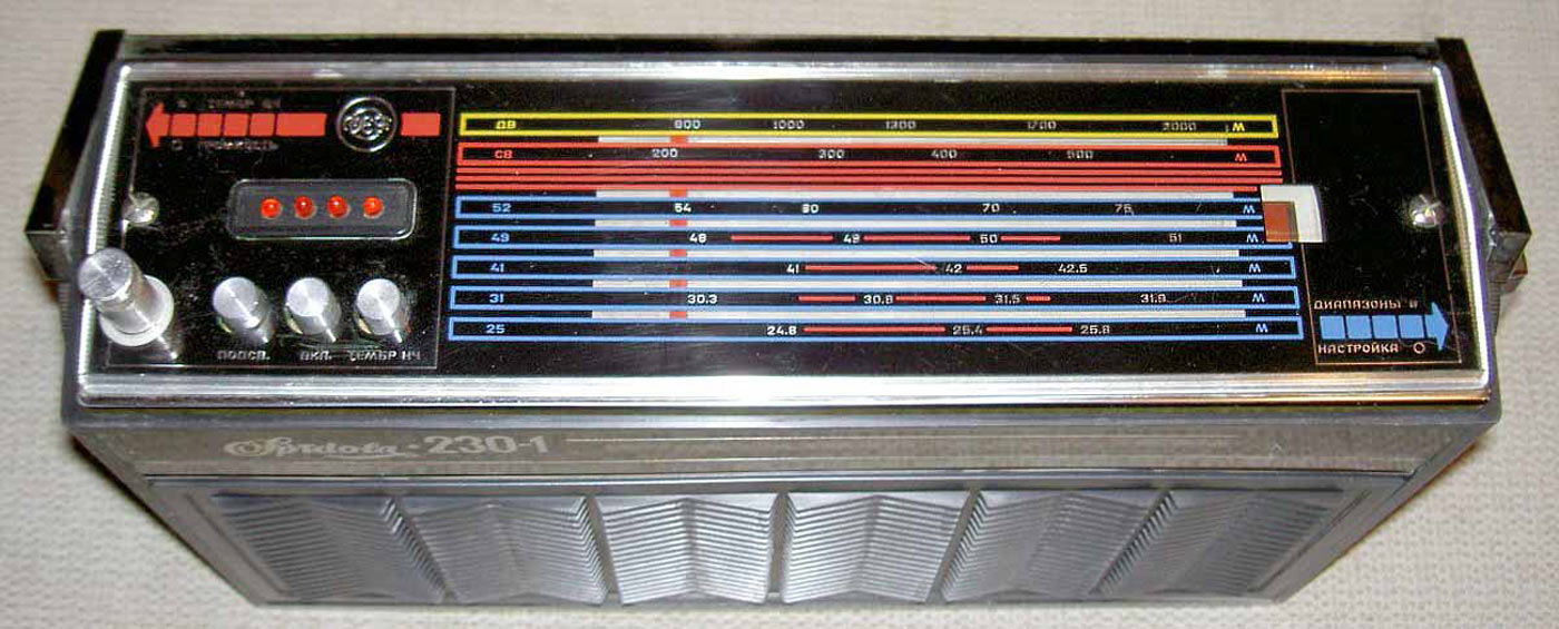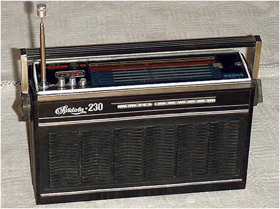 Переносные радиоприёмники *Спидола-230* и *Спидола-230-1* с 1973 и 1975 года выпускал Рижский радиозавод *ВЭФ*. Радиоприёмники 2 класса **Спидола-230** и **Спидола-230-1** предназначены для приёма в диапазонах ДВ, СВ и 5-ти поддиапазонах КВ. Модели имеют встроенную магнитную антенну, а в диапазоне КВ штыревую телескопическую, плавную регулировку тембра ВЧ и ступенчатую на два положения НЧ, индикатор настройки, подсветку шкалы, гнёзда для внешней антенны и заземления, магнитофона на запись, головного телефона, громкоговорителя и внешнего питания. Выпускаемый с 1975 года приёмник **Спидола-230-1** кроме наименования не отличается от модели **Спидола-230**. Чувствительность с магнитной антенной в диапазонах ДВ - 1,5, СВ - 0,8 мВ/м, со штыревой в поддиапазонах KB - 200 мкВ. С внешней антенной в ДВ - 300, СВ и KB не менее 200 мкВ. Избирательность в диапазонах ДВ, СВ - 34 дБ. ПЧ - 465 кГц. Действие АРУ: при изменении сигнала на входе на 30 дБ изменение напряжения на выходе 10 дБ. Полоса воспроизводимых частот - 125...4000 Гц. Номинальная выходная мощность 0,4 Вт, максимальная 0.8 Вт. Питание от шести элементов типа А-373. Габариты радиоприёмника - 365 х 250 х 100 мм. Масса без источников питания - 3,2 кг.