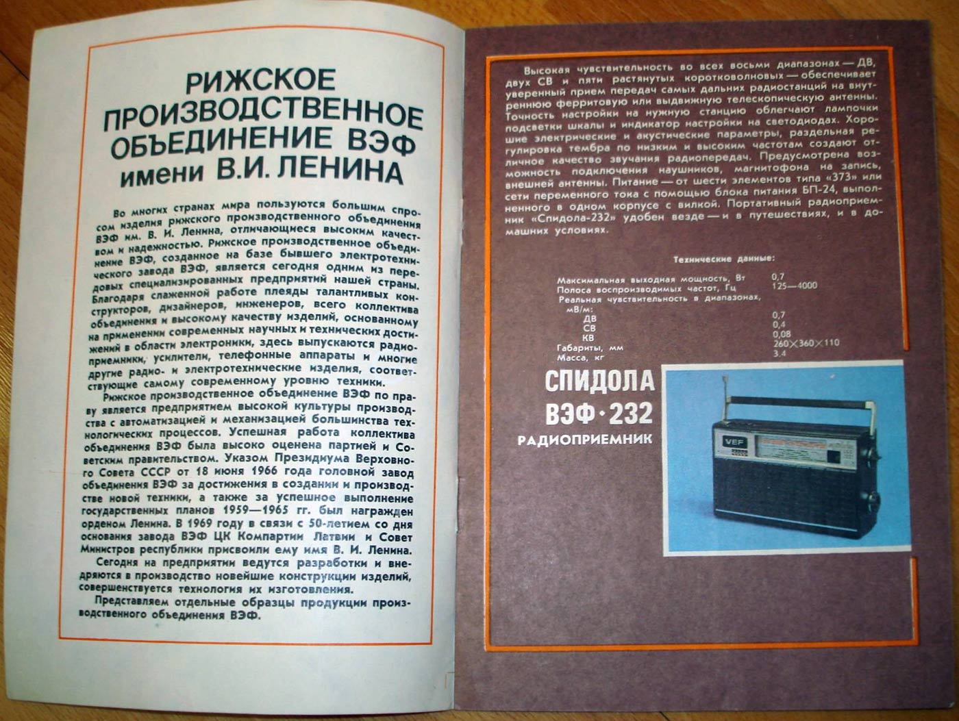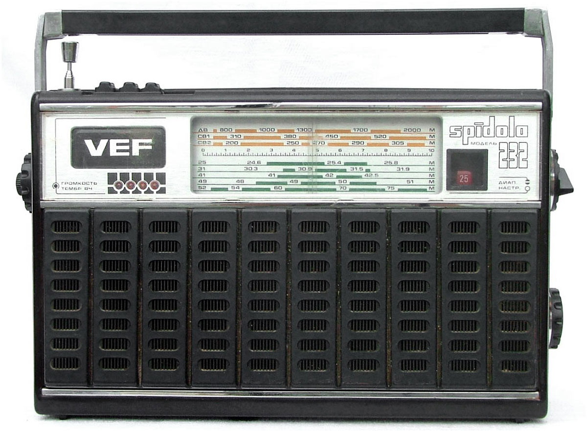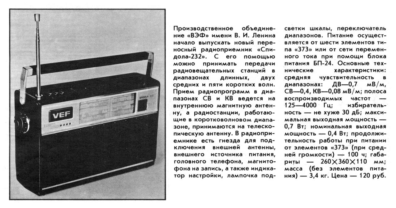 Портативный радиоприёмник *Спидола-232* с 1979 года выпускал Рижский Государственный электротехнический завод ВЭФ. Переносный транзисторный приёмник 2-го класса **Вэф-Спидола-232** рассчитан на приём радиостанций в диапазонах ДВ, СВ и КВ1...KB4. Приём ведется на внутренние магнитную и телескопическую антенны. В приёмнике имеются светодиодный индикатор настройки служащий и для контроля степени разряда батарей, подсветка шкалы, гнёзда головных телефонов, внешней антенны, магнитофона для записи и внешнего питания. Имеется раздельная регулировка тембра по НЧ и по ВЧ. Питание осуществляется от 6 элементов типа А-373 или сети переменного тока через внешний блок питания типа **БП-24**. Основные технические характеристики: Реальная чувствительность в диапазоне ДВ - 0,7 мВ/м, СВ - 0,4 мВ/м, KB - 0,08 мВ/м. Номинальная выходная мощность 0,4 Вт. Номинальный диапазон воспроизводимых громкоговорителем звуковых частот - 125...4000 Гц. Габариты радиоприёмника - 260х360х110 мм. Масса без батарей - 3,4 кг. Розничная цена - 120 рублей.