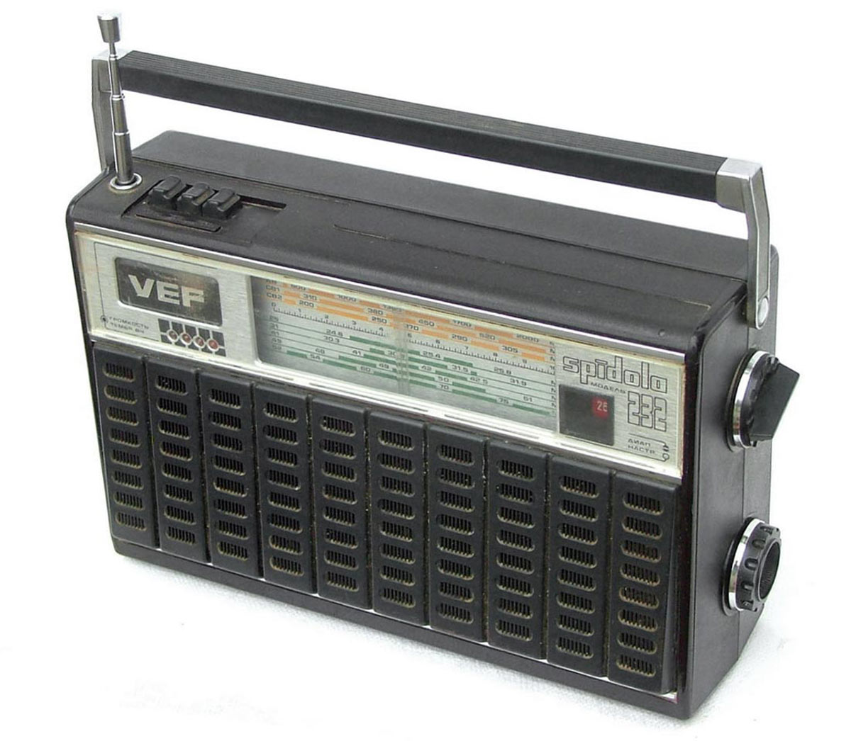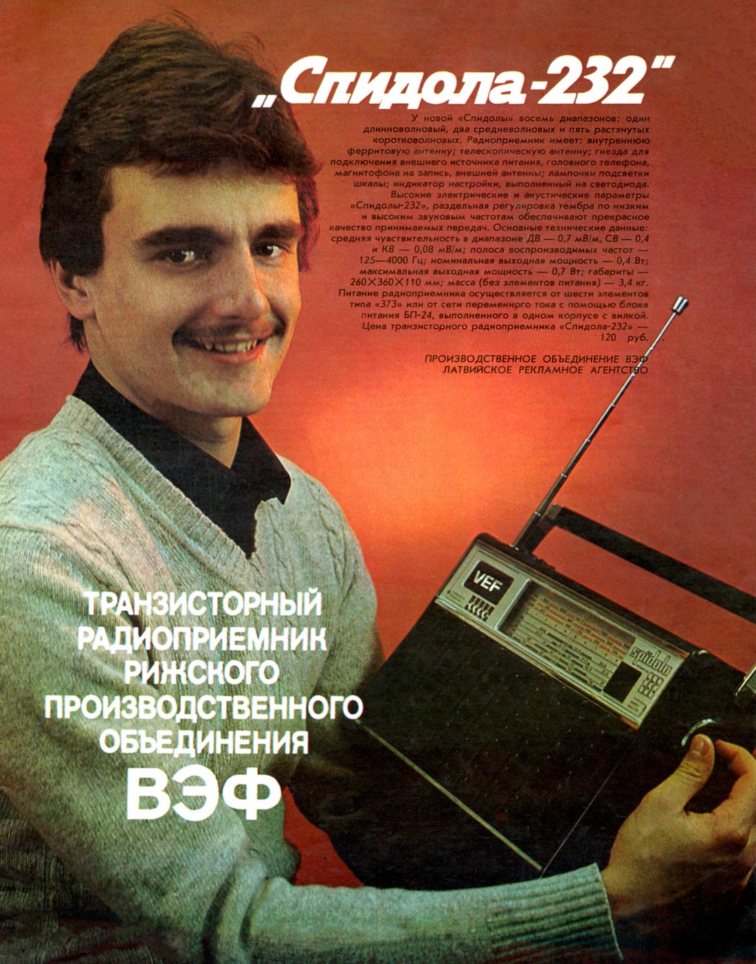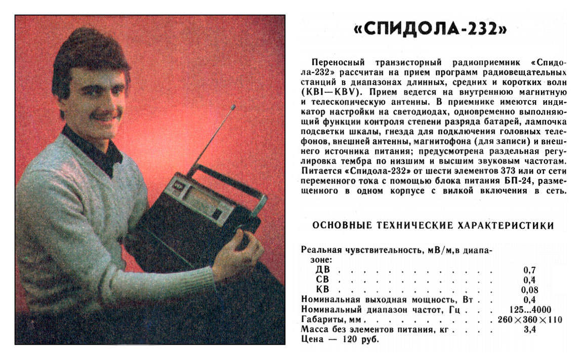 Портативный радиоприёмник *Спидола-232* с 1979 года выпускал Рижский Государственный электротехнический завод ВЭФ. Переносный транзисторный приёмник 2-го класса **Вэф-Спидола-232** рассчитан на приём радиостанций в диапазонах ДВ, СВ и КВ1...KB4. Приём ведется на внутренние магнитную и телескопическую антенны. В приёмнике имеются светодиодный индикатор настройки служащий и для контроля степени разряда батарей, подсветка шкалы, гнёзда головных телефонов, внешней антенны, магнитофона для записи и внешнего питания. Имеется раздельная регулировка тембра по НЧ и по ВЧ. Питание осуществляется от 6 элементов типа А-373 или сети переменного тока через внешний блок питания типа **БП-24**. Основные технические характеристики: Реальная чувствительность в диапазоне ДВ - 0,7 мВ/м, СВ - 0,4 мВ/м, KB - 0,08 мВ/м. Номинальная выходная мощность 0,4 Вт. Номинальный диапазон воспроизводимых громкоговорителем звуковых частот - 125...4000 Гц. Габариты радиоприёмника - 260х360х110 мм. Масса без батарей - 3,4 кг. Розничная цена - 120 рублей.