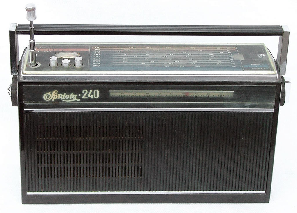 Портативный радиоприёмник *Спидола-240* с 1978 года выпускал Рижский радиозавод ВЭФ. Радиоприёмник **Спидола-240** выпускался на экспорт. Он предназначен для приёма радиовещательных станций в диапазонах ДВ, СВ и 7 поддиапазонах коротких волн. Для радиоприёма в ДВ, СВ диапазонах имеется магнитная антенна, для приёма в КВ поддиапазонах телескопическая. Имеется гнездо для внешней антенны; внешнего источника питания; гнездо головного телефона и внешнего громкоговорителя; гнездо включения магнитофона на запись. Имеется ступенчатое и плавное регулирование тембров по НЧ и ВЧ. Диапазоны частот: ДВ 150...408 кГц; СВ 525...1605 кГц; КВ поддиапазоны 2,0...5,0; 5,0...7,4; 9,5...9,775; 11.7...12,1; 15,1...15,45; 17.7...17,9; 21.45...21,75 МГц. Чувствительность в диапазоне ДВ - 600 мкВ/м СВ - 300 мкВ/м, KB 100...150 мкВ. Полоса воспроизводимых частот при работе на громкоговоритель 125..4000 Гц. Максимальная выходная мощность 700 мВт. Габариты радиоприёмника - 250х365х105 мм. Его вес 3,3 кг.