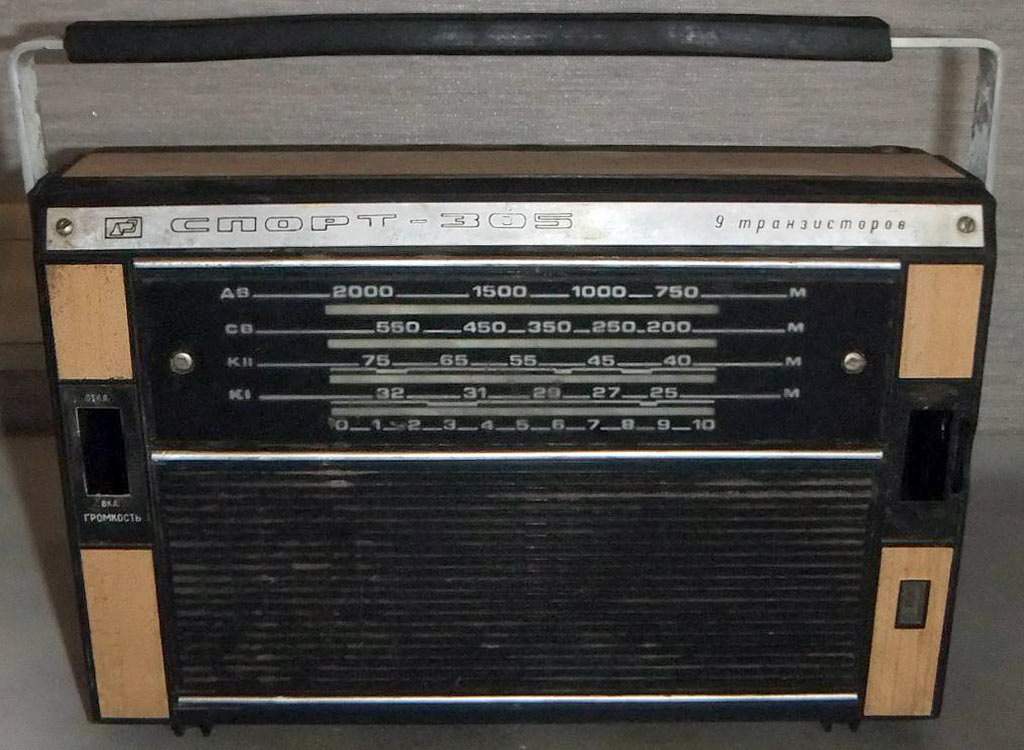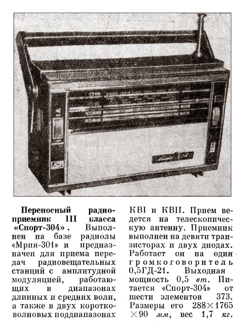 Переносные радиоприёмники *Спорт-304* и *Спорт-305* с 1971 и с 1972 года выпускал Днепропетровский радиозавод. Радиоприёмник третьего класса **Спорт-304** выполнен на основе радиолы **Мрия-301** и предназначен для приёма передач вещательных радиостанций, работающих в диапазонах ДВ, СВ, а также в 2-х коротковолновых поддиапазонах КВ1 и КВ2. Приём в поддиапазонах КВ производится на телескопическую антенну. Радиоприёмник выполнен на 9-ти транзисторах и 2-х диодах. Громкоговоритель применён типа 0,5ГД-21. Максимальная выходная мощность 0,5 Вт. Питается приёмник *Спорт-304* от 6 элементов типа 373. Габариты приёмника 288х176х90 мм, его масса 1,7 кг. **Спорт-305** является модернизацией модели **Спорт-304**. По схеме и конструкции он ему аналогичен, отличаясь лишь оформлением и громкоговорителем (не всегда). Размеры модели 288х184х88 мм. Масса 1,6 кг.