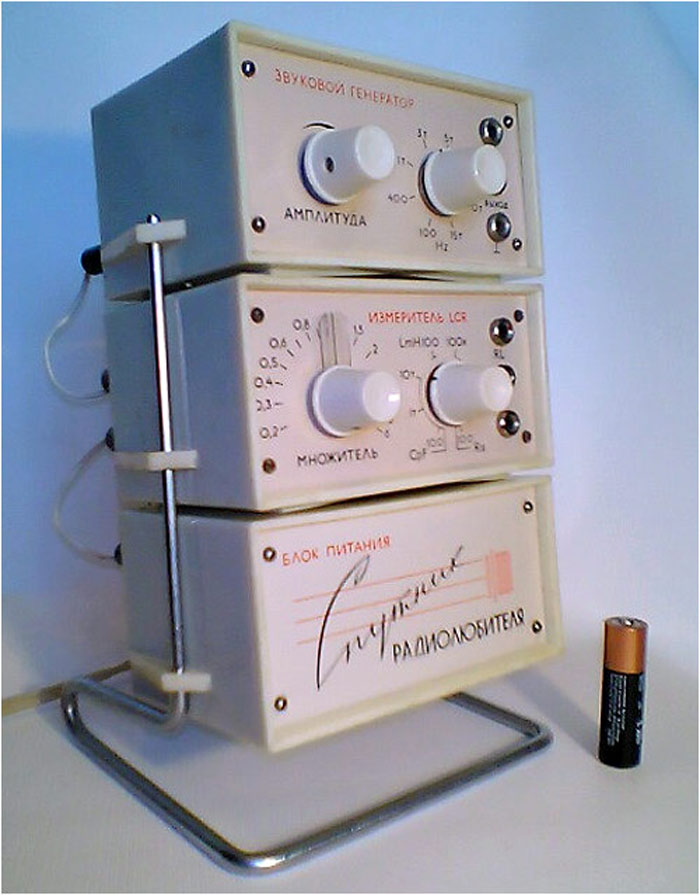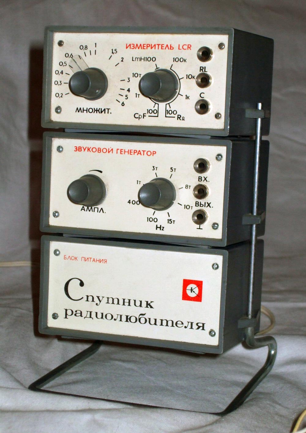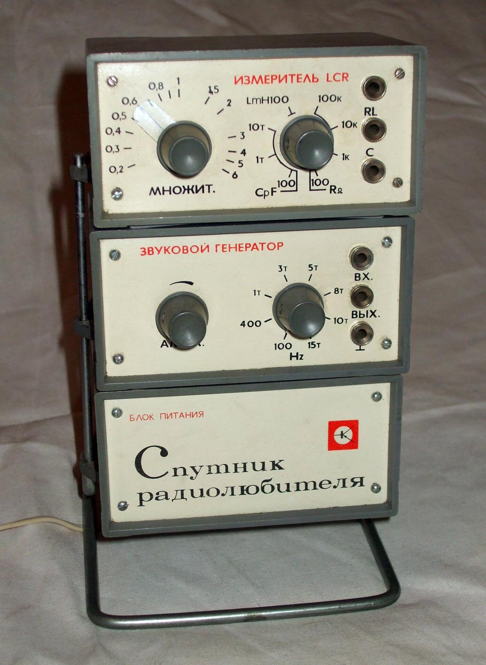 Комплект приборов *Спутник радиолюбителя* с 1967 года выпускал Курский завод *Маяк*. В комплект входит три блока, это звуковой генератор, измеритель RCL и блок питания. Завод рекламировал дальнейшее комплектование комплекта ещё и другими приборами, но так ничего больше выпущено не было. Звуковой генератор комплекта работает на 8 фиксированных частотах в диапазоне от 100 Гц до 15 Кгц. Измеритель RCL может измерять номиналы резисторов в диапазоне от 20 Ом до 500 кОм, индуктивностей от 20 до 500 мгн и ёмкостей от 20 пф до 20 мкф. Блок питания сетевой, без добавочной батареи или батарейный, одна батарея КБС или три-четыре элемента типа ФБС. Габариты комплекта *Спутник радиолюбителя* - 220х140х110 мм, масса каждого блока 1, 3 и 1 кг. соответственно.