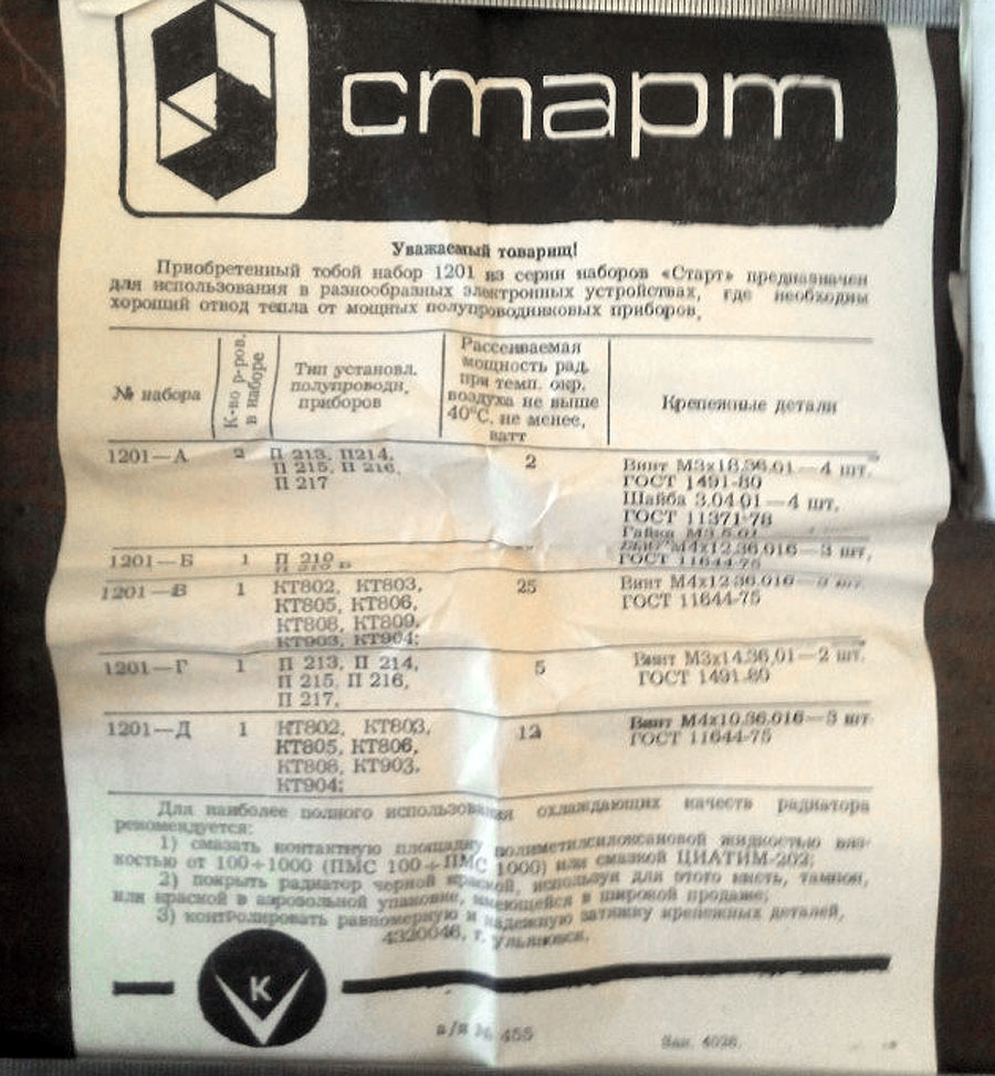Набор *Старт-1201* предполжительно с 1978 года выпускал Ульяновский механический завод. В наборе один радиатор для охлаждения мощных транзисторов и крепёжные детали. В зависимости от буквы в наборе (А,Б,В,Г,Д) радиатор подходил по креплению определённому типу транзистора.