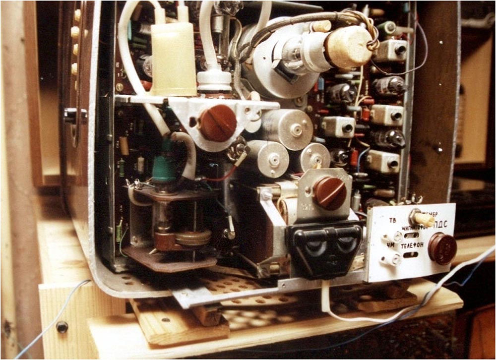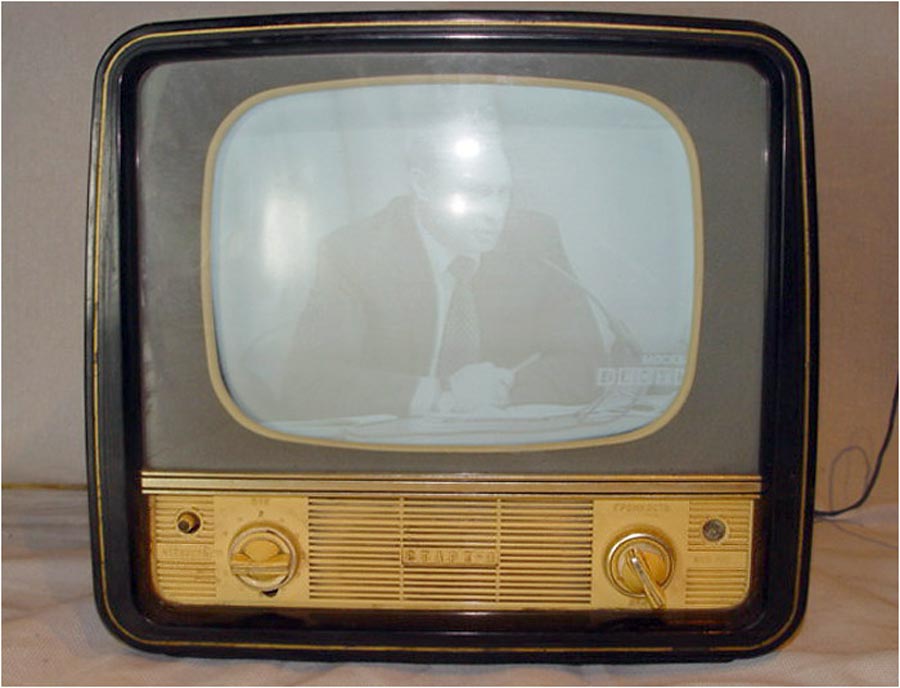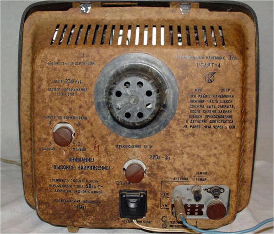 Телевизионный приёмник чёрно-белого изображения *Старт-4* выпускал с 1967 года Московский радиотехнический завод. Настольный ламповый телевизор третьего класса **Старт-4** создан на основе модернизированной модели **Старт-3**, практически схож с ней по оформлению и отличается только новыми ПЧ в связи с применением селектора каналов ПТК-5С и установкой более совершенного кинескопа, с алюминированным экраном 35ЛК6Б, который имеет повышенные светотехнические параметры, короткую горловину и не требует ионной ловушки. По электрической схеме, конструкции шасси и узлам аппараты имеют сходство. Потребляемая телевизором **Старт-4** от сети мощность при приёме телевидения около 140 Вт, а при приёме радиостанций 50 Вт. Габариты телевизора - 400х423х460 мм. Масса 22 кг. Цена 239 рублей. Подробнее о модели в документации.