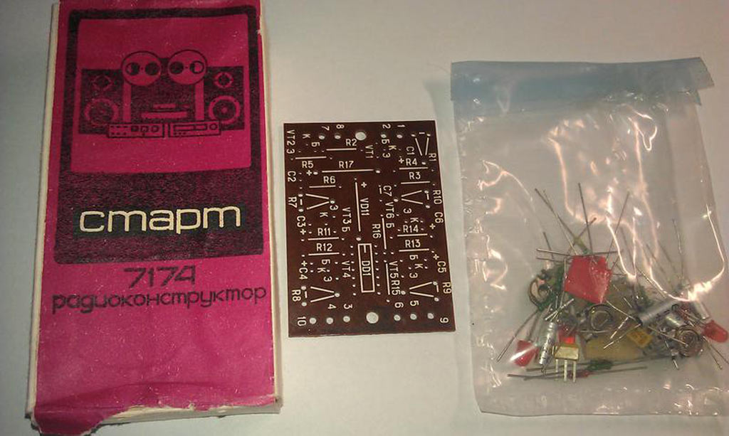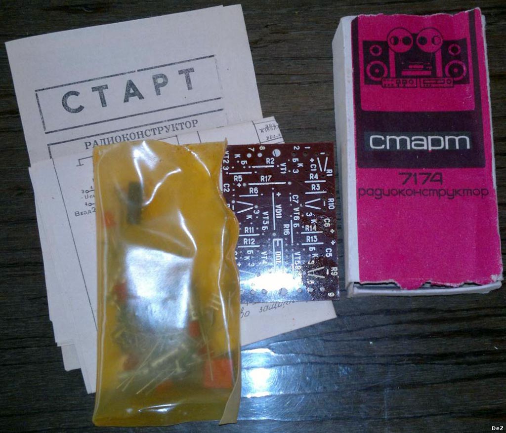 Радиоконструктор *Старт-7174* (Светодиодный индикатор уровня) с I-кв 1984 года выпускал Каменец-Подольский завод *Электроприбор*. РК позволяет собрать светодиодный индикатор уровня предназначенный для использования при конструировании и усовершенствовании любых магнитофонов или УНЧ. Индикатор позволяет регистрировать кратковременные пики сигнала, при которых стрелка обычного индикатора не успевает отклониться. Индикатор можно подсоединить к линейному выходу магнитофона или выходу УМ, что даёт возможность визуально контролировать и мощность. Диапазон рабочих частот 20...20000 Гц. Динамический диапазон 25 дБ. Размер платы 69x130x29 мм. Масса 120 гр.