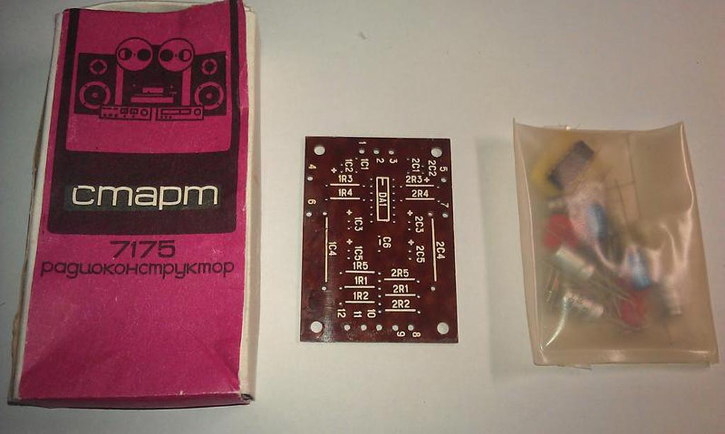 Радиоконструктор *Старт-7175* (Усилитель воспроизведения магнитофона) с 1984 года выпускал Каменец-Подольский завод *Электроприбор*. РК *предназначен для детей старшего школьного возраста и для радиолюбителей. Он позволяет собрать усилитель воспроизведения для стереофонического магнитофона, который предназначен для частотной коррекции и усиления сигнала поступающего с воспроизводящей головки до величины, достаточной для подачи на линейный вход усилителя мощности низкой частоты. Усилитель можно применить при изготовлении и модернизации магнитофонов самых различных классов. С применением усилителя можно собрать и магнитофон-проигрыватель. Технические параметры: Диапазон частот звука на скорости 19,05 см/с - 40...18000 Гц. Коэффициент нелинейных искажений 0,2 %. Номинальное выходное напряжение на частоте 1 кГц при напряжении на входе 1 мВ - 250 мВ. Уровень шумов -56 дБ. Напряжение питания 12...18 В. Габариты платы - 40x80х130 мм. Масса 150 г.
