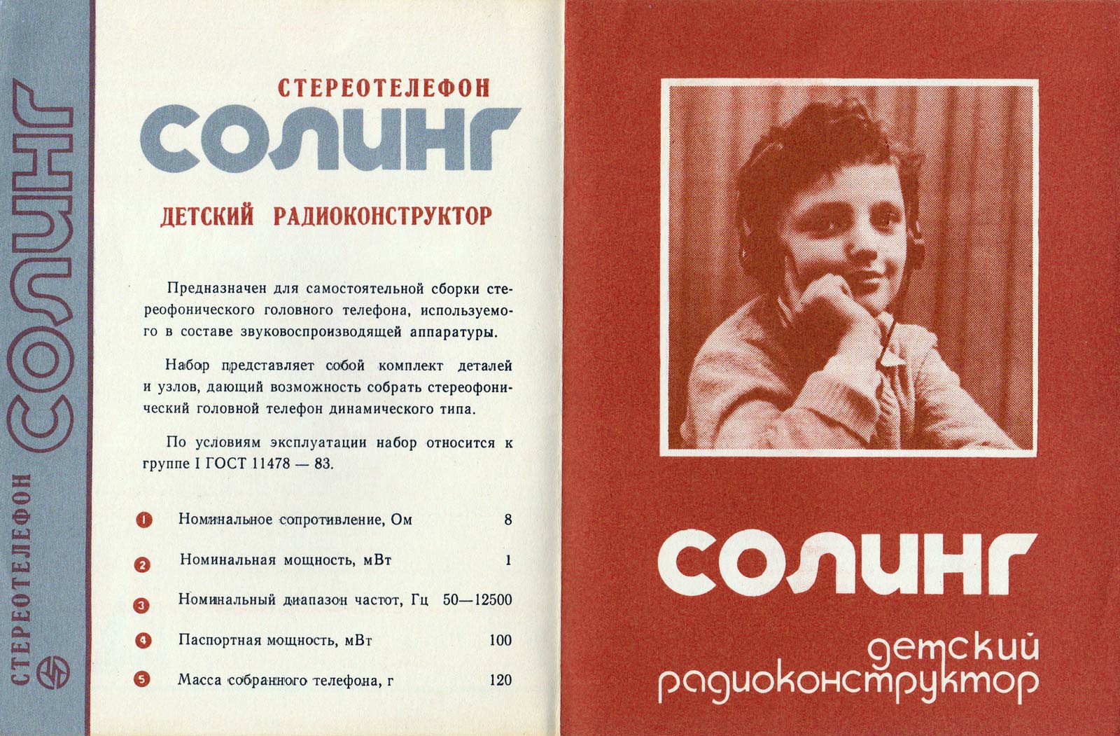 Детский радиоконструктор *Старт-7198* (стереотелефоны *Солинг*) выпускался с 1985 года в Киеве (абонементный ящик 649/01). Радиоконструктор позволяет собрать головные стереофонические телефоны. Диапазон рабочих частот - 50...12500 Гц. Номинальная подводимая мощность 1 мВт, максимальная 100 мВт.