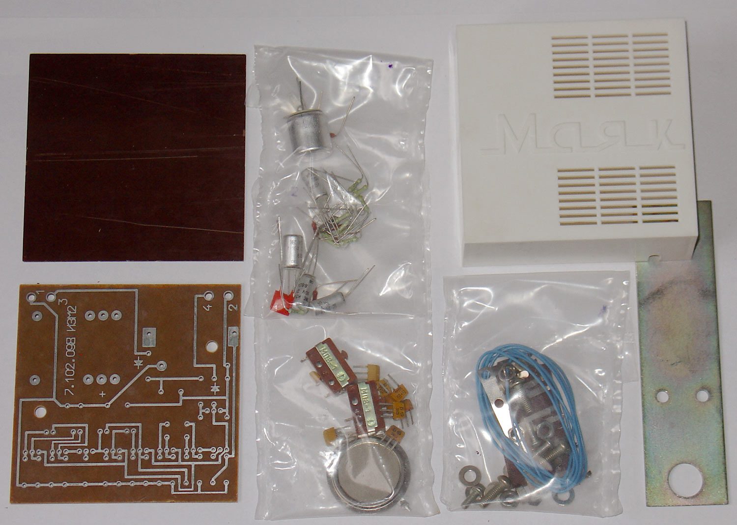 Радиоконструктор *Старт-7216* (сигнализатор музыкальный) с середины 1987 года выпускал Ровненский завод им. 60-летия Октября. Содержит корпус, печатную плату и детали из которых можно по приложенной инструкции собрать музыкальный сигнализатор - устройство издающее сигнал напоминающий пение птиц. Сигнализатор выполнен на девяти транзисторах КТ315. Звуковой сигнал генерируется пьезокерамическим излучателем типа ЗП-3. Узел управления устройством позволяет либо подавать сигнал только тогда, когда нажата кнопка, замкнуты контакты какого-либо переключателя, либо в течение примерно 5 секунд после кратковременного нажатия на кнопку. В описании к РК даны различные варианты применения сигнализатора. Он может быть, например, использован как датчик наличия влаги, наполнения резервуара водой, степени увлажнения ткани и т.п. Питание сигнализатора, осуществляют от батареи Крона, которая размещается внутри корпуса. Напряжение питания может лежать в пределах от 9 до 15 В. Потребляемый ток не превышает 80 мА. Габариты конструкции 125х94х35 мм, вес 200 г. Цена 7 рублей.
