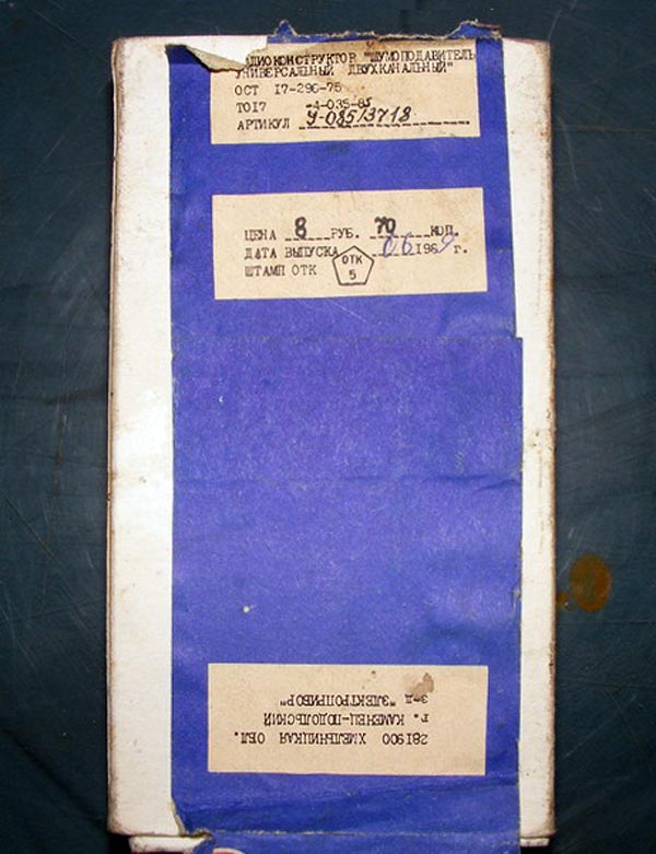 Радиоконструктор *Шумоподавитель универсальный двухканалный* с 1986 года выпускал Каменец-Подольский завод *Электроприбор*. Конструктор позволяет из радиодеталей, на печатной плате собрать универсальный двухканальный шумоподавитель, предназначенный для работы в трактах высококачественных стереофонических звуковоспроизводящих устройств. Рабочий диапазон звуковых частот 20...20000 Гц. Номинальное входное напряжение 0,25 В. Напряжение питания - 12...15 В. Входное сопротивление - 30 кОм. Коэффициент передачи - 1. Коэффициент гармоник на выходе 0,5%. Подавление шума 10 дБ. Переходное затухание между каналами 40 дБ. Потребляемый ток 20 мА. Габариты платы 95х170х50 мм. Вес 150 гр.