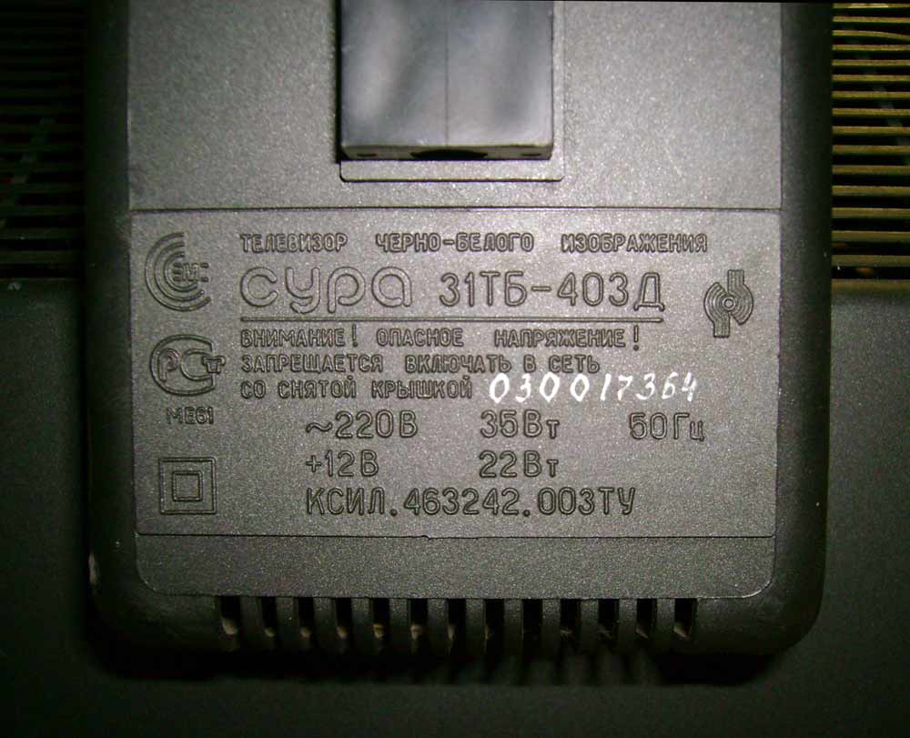 Телевизионный приёмник чёрно-белого изображения *Сура 31ТБ-403Д* с 1998 года выпускало ОАО *Пензенский радиозавод*. Телевизор *Сура 31ТБ-403Д* предназначен для приёма телевизионных программ в МВ и ДМВ диапазонах. В память микропроцессора можно записать до 51 телевизионных программ. Кинескоп применён типа 31ЛК4Б. Чувствительность в МВ диапазоне 20 мкВ, в ДМВ диапазоне 30 мкВ. Диапазон воспроизводимых частот 240...8000 Гц. Номинальная выходная мощность 0,6 Вт. Питание от сети или аккумулятора. Габариты ТВ 298х320х362 мм. Масса 7 кг. Одновременно завод выпускал и телевизор *Сура 31ТБ-404Д*, который лишь комплектовался беспроводным пультом дистанционного управления всеми функциями.
