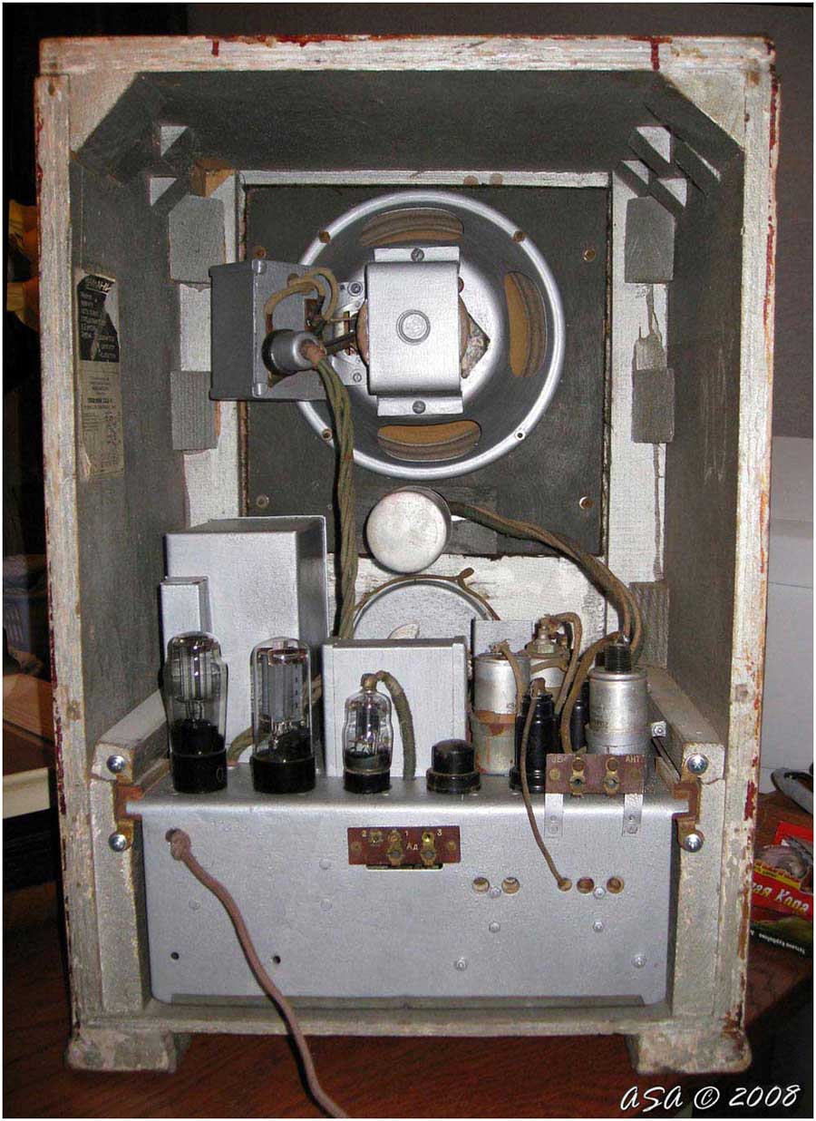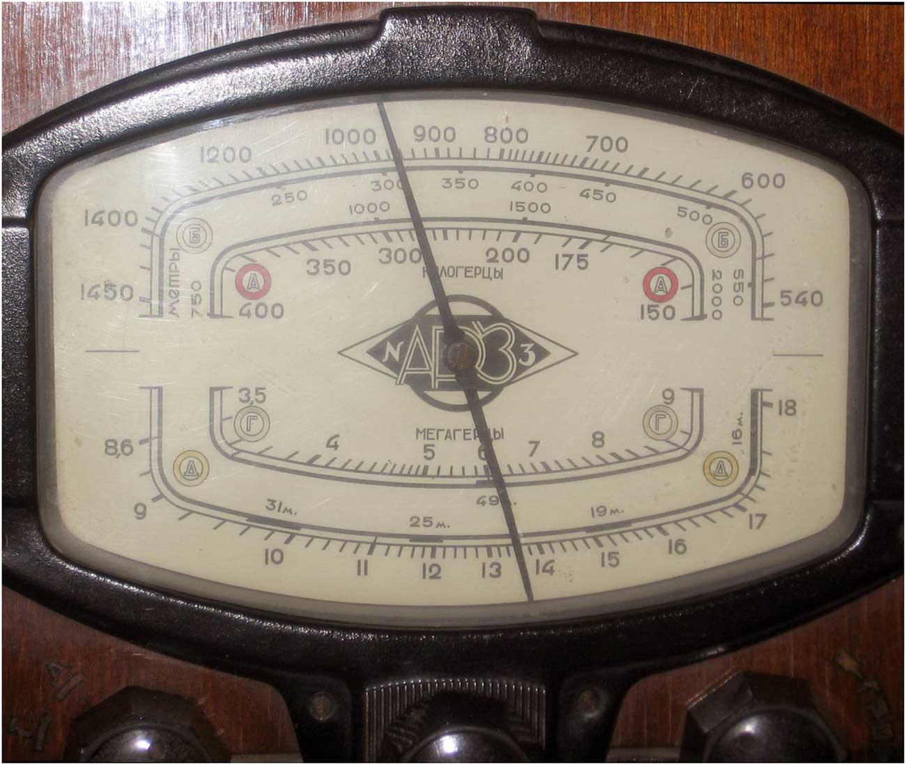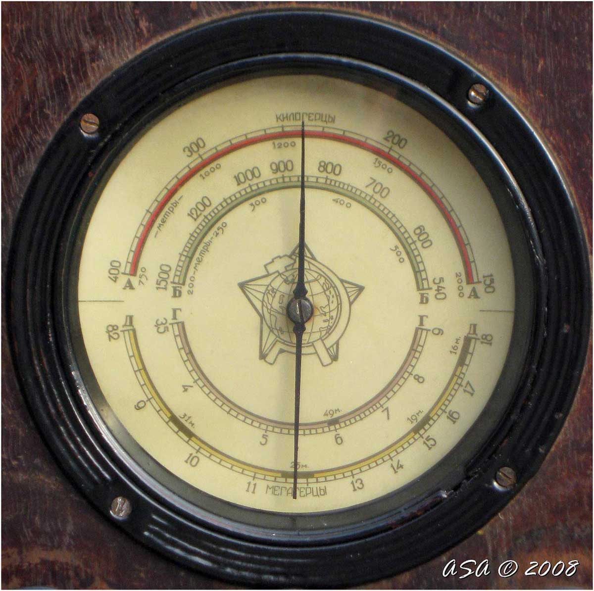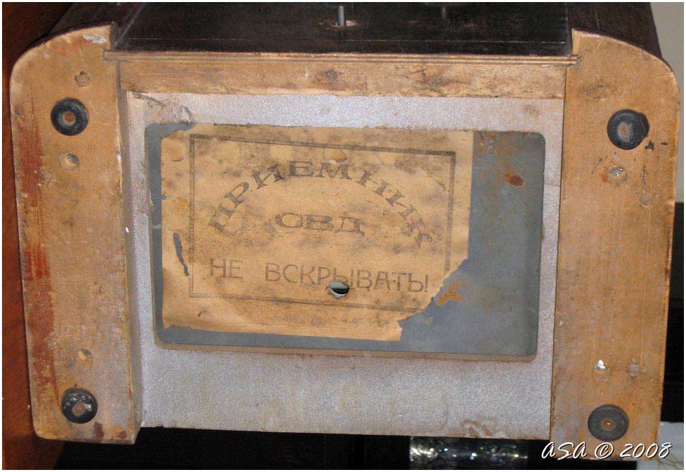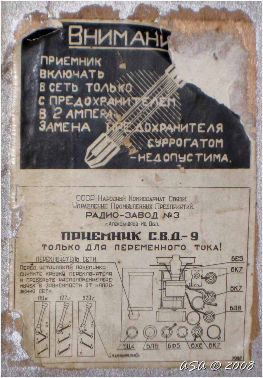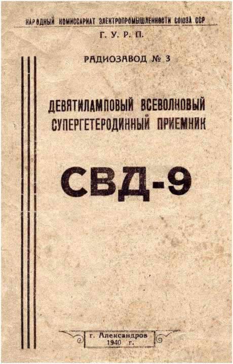 Радиоприёмник сетевой ламповый *СВД-9* с начала 1938 года выпускал Александровский радиозавод № 3 НКС. За время производства приёмников серии **СВД** их электрическая схема изменялась, а в соответствии с ней менялось и наименование модели. Очередная модернизация получила наименование **СВД-9**. В 1940 году круглая шкала приёмника была заменена на овальную, также частично модернизирована электрическая и монтажная схема. Радиоприёмник **СВД-9** собран на 9 лампах типов: 6К7, 6А8, 6Х6, 6Ф5, 6Л6, 5Ц4, 6Е5. Диапазоны ДВ (А) 750-2000 м, СВ (Б) 200-556 м, КВ (Г) 85,7-33,3 м, КВ (Д) 36,6-16,7 м. Чувствительность приёмника около 30 мкВ. Промежуточная частота 445 кГц. Номинальная выходная мощность усилителя приёмника 3, максимальная 7 Вт. Диапазон звуковых частот 100...4000 Гц. Потребляемая от сети мощность 100 Вт. Размеры приёмника 560х360х290 мм. Масса 16 кг. Приёмник собран в футляре из многослойной фанеры и дерева, покрыт лаком. Круглая, позже овальная шкала приёмника защищена стеклом. В центре шкалы эмблема: земной шар со звездой, серпом и молотом, на овальной - логотип Александровского радиозавода. Над шкалой находится индикатор настройки с козырьком. Ручек управления четыре. Первая переключатель диапазонов (А-Б-Г-Д), далее настройка и громкость. Нижняя регулятор тембр и выключатель сети. Двойная ручка настройки с редуктором. Громкоговоритель **ГМЭ-1** с подмагничиванием.