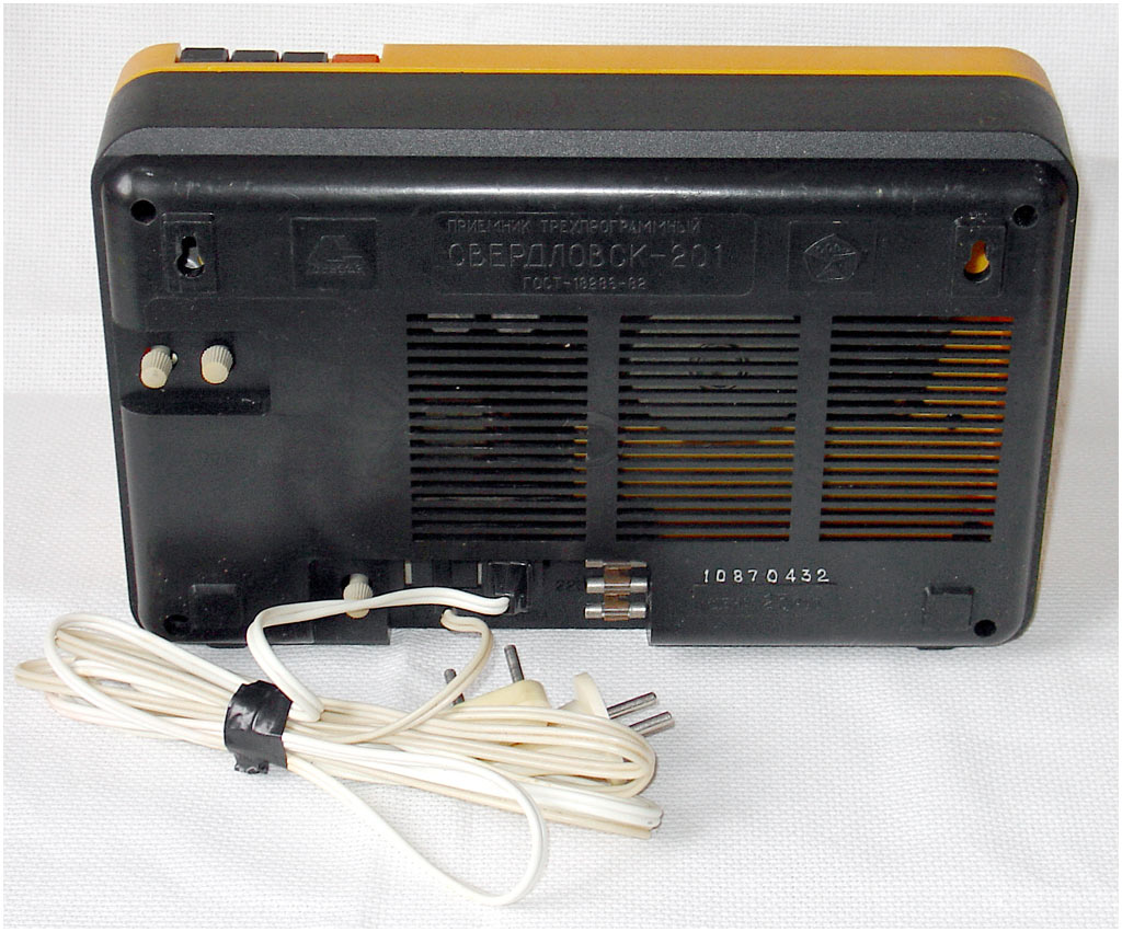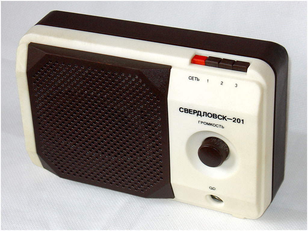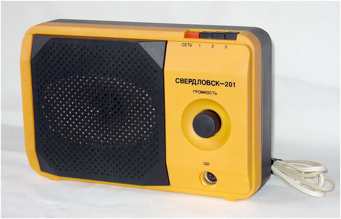 Приёмник трёхпрограммный *Свердловск-201* с 1986 года выпускал Свердловский завод радиоаппаратуры. ПТ **Свердловск-201**, (с 1987 года **Свердловск ПТ-201**) - предназначен для воспроизведения программ, передаваемых по сети трёхпрограммного проводного радиовещания. Он рассчитан на проводную уплотнённую радиосеть с напряжением 30 в. Питание ПТ производится от электросети в 220 вольт.Для прослушивания первой, основной программы ПТ может использован и как обычная радиоточка без включения в электрическую сеть. Диапазон звуковых частот на основном канале с усилением или без 100...10000 Гц, двух ВЧ каналов 100...6300 Гц. Частоты ВЧ каналов - 78 и 120 кГц.