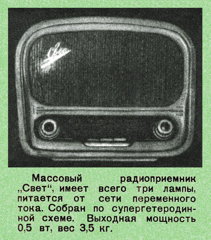 Радиоприёмник сетевой ламповый *Свет* с 1956 года выпускал Ижевский радиозавод. Сетевой радиоприёмник 4-го класса **Свет** разработан в Институте радиовещательного приёма и акустики имени А.С.Попова и передан для производства на Ижевский радиозавод. Приёмник задуман как массовый и дешёвый. Он представляет собой трёхламповый двухдиапазонный ДВ, СВ супергетеродин с питанием от сети, с выпрямителем на диодах. Чувствительность приёмника в обоих диапазонах 500 мкВ. Избирательность по соседнему каналу 16 дБ. Номинальная выходная мощность 0,5 Вт. Диапазон воспроизводимых звуковых частот 150...4000 Гц. Потребляемая мощность 30 Вт. Габариты модели 280х216х150 мм, вес 3,5 кг. Цена 24 рубля 60 копеек с 1961 года.