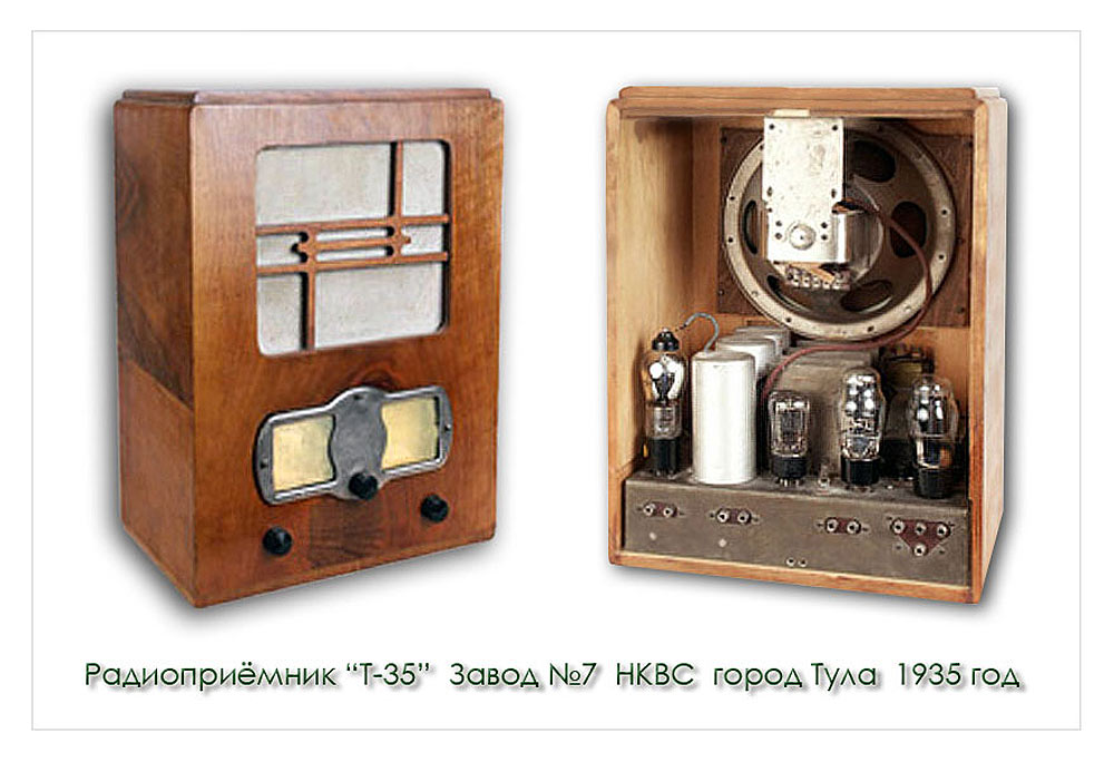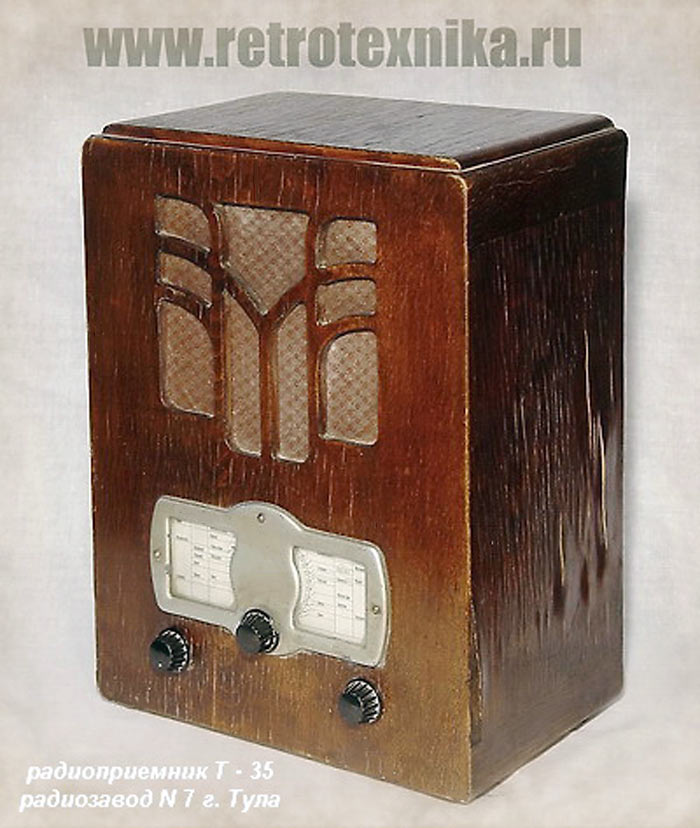 Радиоприёмник сетевой ламповый *Т-35* с 1935 до 1938 года выпускал Тульский Государственный союзный завод № 7 НКВС/НКПиТ. Радиоприёмник **Т-35** предназначен для работы в местностях имеющих электросеть переменного тока. Он собран на 5 лампах по схеме прямого усиления. Диапазоны принимаемых радиоволн: 200...2000 метров. В приёмнике применена регулировка обратной связи, поэтому чувствительность и избирательность сильно зависят от положения её регулятора. Есть вход для включения адаптера, внутренний громкоговоритель. Подробнее в прилагаемой ниже документации.
