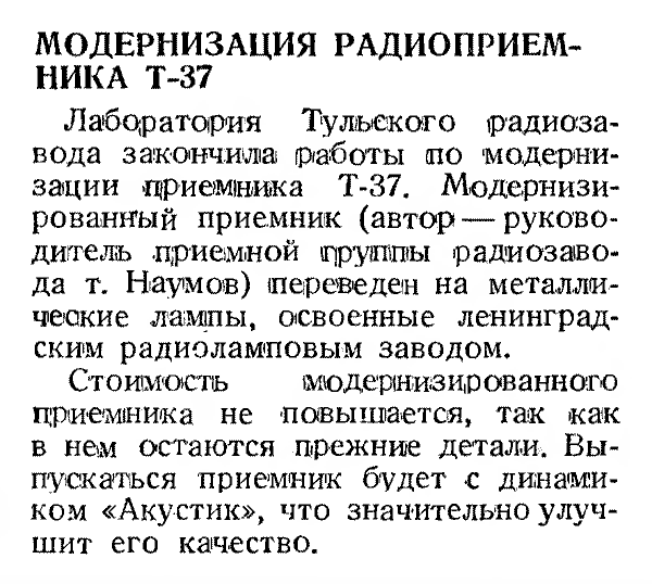 Радиоприёмник сетевой ламповый *Т-37* серийно выпускал с 1938 года Тульский радиозавод № 7. Модель *Т-37* представляет собой пятиламповый радиоприёмник прямого усиления с питанием от сети переменного тока. Радиоприёмник работает в 2-х диапазонах 1853...726 метров и 576...220 метров (Длинные и Средние волны). Номинальная выходная мощность 1 Вт. Потребляемая мощность 60 Вт. В 1939 году радиоприёмник был модернизирован. Подробнее в приведённой документации.