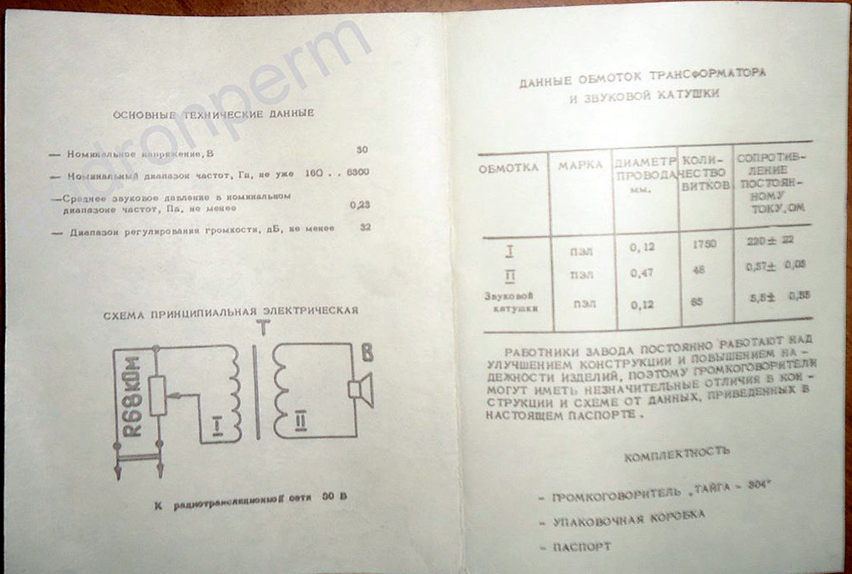 Абонентский громкоговоритель "Тайга-304" возможно с 1976 года выпускал Пермский телефонный завод. АГ предназначен для работы от радиотрансляционной сети с напряжением в 30 вольт. АГ выполнен в бакелитовом (чёрного цвета) или пластмассовом (разных цветов) корпусе с пластмассовой накладкой. Диапазон воспроизводимых звуковых частот 160...10000 Гц. Габариты АГ - 260х160х70 мм, масса 1,5 кг. Цена 5 рублей. Выпускался до начала 90-х годов.