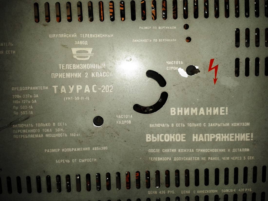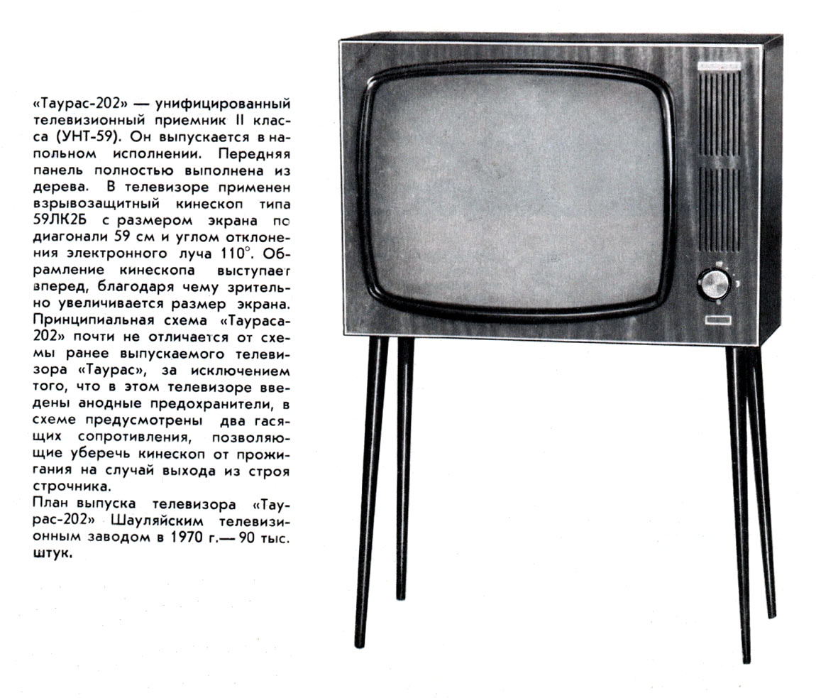 Телевизор *Таурас-202* с 1970 года выпускал Шауляйский телевизионный завод. **Таурас-202** унифицированный телевизионный приёмник 2-го класса (УЛТ-59-II-1) выпускался в настольном и напольном (на ножках) оформлении с вариантами отделки корпуса и передней панели. В телевизоре применен кинескоп 59ЛК2Б или 59ЛК2Б-С, с размером экрана по диагонали 59 см и углом отклонения электронного луча 110 градусов. Телевизор обеспечивает: приём телевизионных передач в любом из 12 каналов, подключение магнитофона для записи звукового сопровождения или его прослушивания на головные телефоны при отключенных динамиках, возможность регулировки громкости и яркости на расстоянии (до 5 м) при помощи проводного пульта ДУ, подключение приставки двух-языкового сопровождения. Пульт ДУ и приставка не в комплекте. АПЧГ обеспечивает переключение каналов без регулировок. АРУ обеспечивает устойчивый приём. Влияние помех сведено к минимуму с АПЧ и Ф. Размер изображения 380х485 мм. Чувствительность 50 мкВ. Разрешающая способность - 450...500 линий. Выходная мощность канала звука 1,5 Вт. Телевизор питается от сети 127 или 220 в. Потребляемая мощность - 180 Вт. В телевизоре использовано 17 радиоламп, 20 полупроводниковых приборов, два громкоговорителя. Габариты телевизора - 703 х 510 х 430 мм. Его масса без ножек 36 кг.