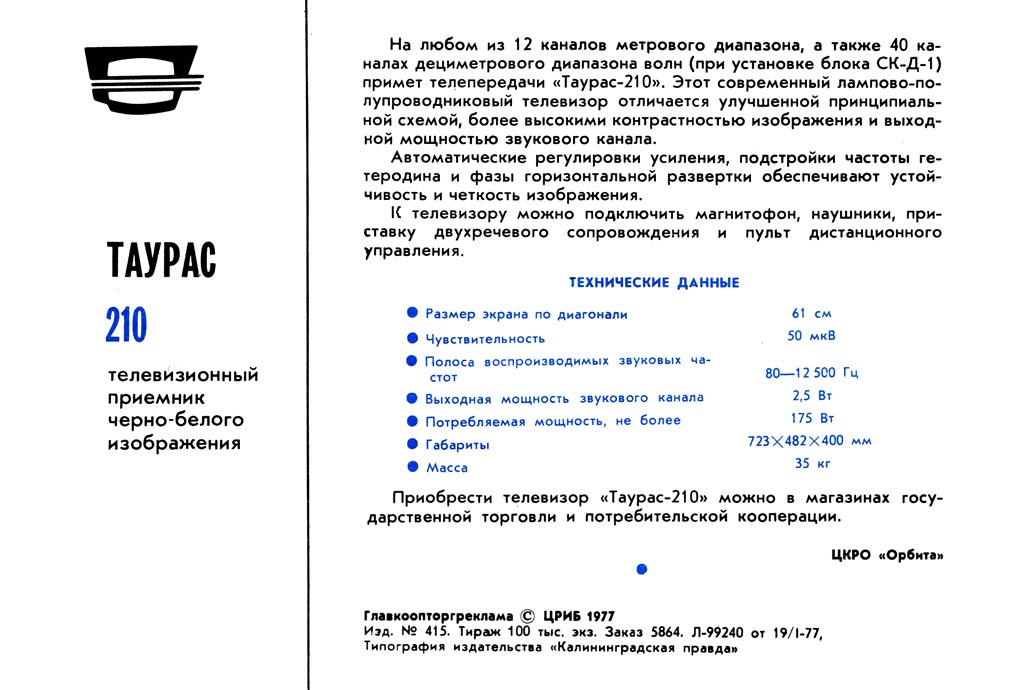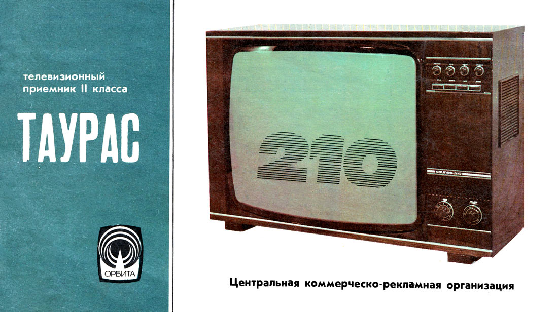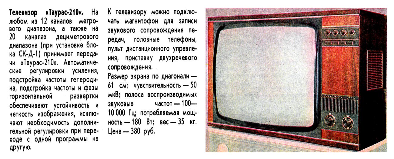 Телевизор ч/б изображения *Таурас-210* с 1978 года выпускал Шауляйский телевизионный завод. Унифицированный лампово-полупроводниковый телевизор второго класса *Таурас-210/Д* (УЛПТ-61-II-28) обеспечивает приём на любом из 12 каналов МВ диапазона, а при установке блока СКД-1 и на любом канале ДМВ диапазона. В телевизорах с индексом *Д* блок *СКД-1* уже установлен. Имеется возможность прослушивания звукового сопровождения на головные телефоны при отключенных громкоговорителях. В телевизоре конструктивно заложена возможность дистанционного управления яркостью, громкостью и отключением громкоговорителей. Кинескоп 61ЛКЗБ с размером экрана по диагонали в 61 см. Канал звукового сопровождения работает на два громкоговорителя, боковой 3ГД-38С и фронтальный 2ГД-36. Чувствительность телевизора - 50 мкВ. Чёткость по вертикали 500, по горизонтали 450 линий. Максимальная выходная мощность - 2,5 Вт. Диапазон воспроизводимых звуковых частот - 100...10000 Гц. Потребляемая мощность 180 Вт. Габариты телевизора - 685х525х420 мм. Его масса - 36 кг. Розничная цена телевизора с ножками 296 рублей.