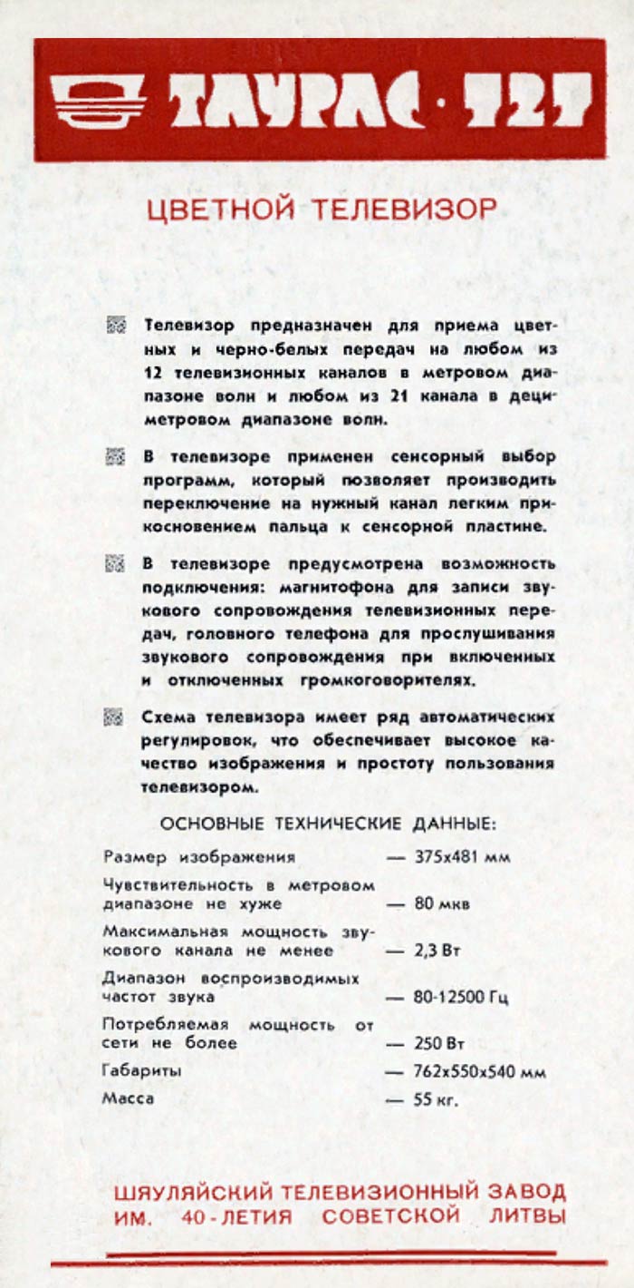 Цветной телевизионный приёмник *Tauras-727* (*Таурас-727*) выпускался с 1981 года Шауляйским телевизионным заводом. Информация ниже.