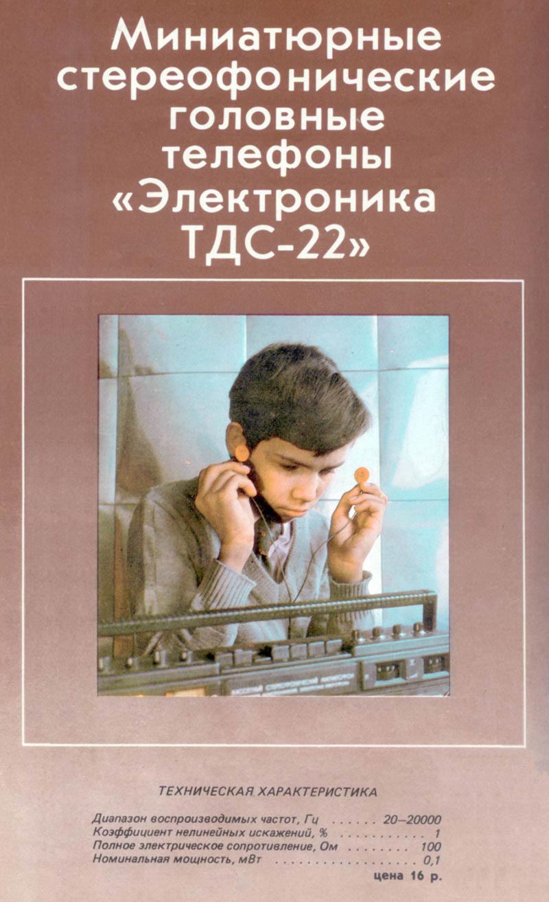 Телефоны динамические стереофонические *Электроника* ТДС-22 и *Электроника* ТДС-22-2 выпускались с 1987 и 1988 года Калужским ПО *Грант*. Малогабаритные вкладные телефоны *Электроника* ТДС-22 и *Электроника* ТДС-22-2 предназначены для индивидуального высококачественного прослушивания монофонических или стереофонических звуковых фонограмм. Номинальный диапазон воспроизводимых частот 20...20000 Гц. Сопротивление 100 Ом. Номинальная мощность 0,1 мВт.