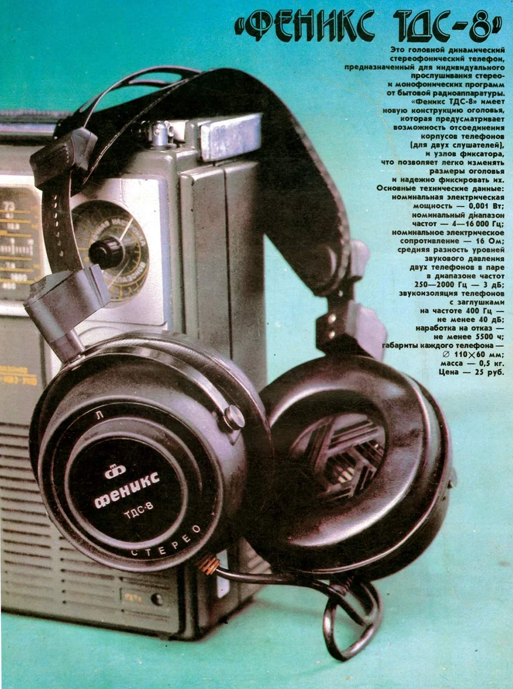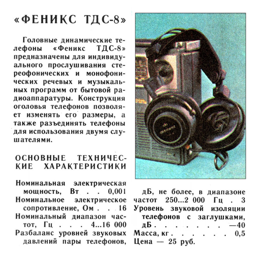 Телефоны головные динамические стереофонические *Феникс ТДС-8* с 1982 года выпускало Львовское ПО имени 50 лет Октября. Телефоны предназначены для индивидуального прослушивания моно и стереофонических программ, воспроизводимых бытовой радиоаппаратурой (электрофонами, магнитофонами, магнитолами, радиоприёмниками, тюнерами, стереофоническими комплексами), имеющей гнездо типа ОНЦ-ВГ4-5/16Р для подключения стереофонических телефонов. Качество звучания телефонов полнее проявляется при их подключении к аппаратуре высшего или 1 классов. Номинальная электрическая мощность 10 мВт. Электрическое сопротивление 16 Ом. Разность уровней звукового давления в диапазоне 250...2000 Гц не более 3 дБ. Диапазон воспроизводимых частот 40...16000 Гц. Вес 0,5 кг.