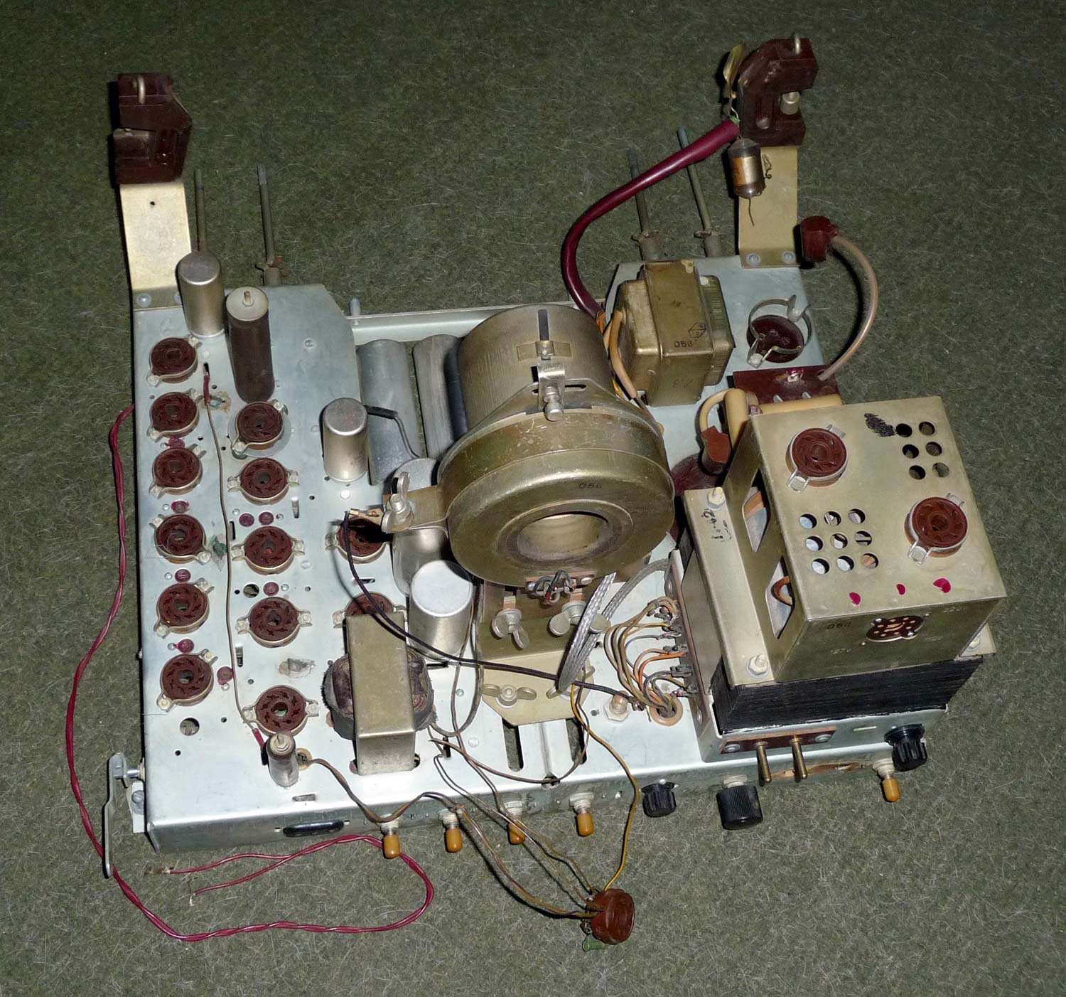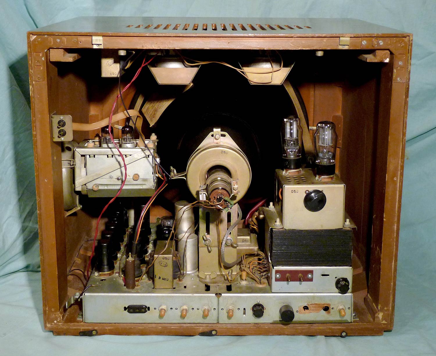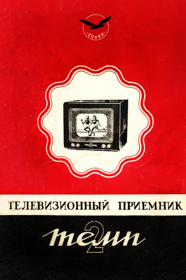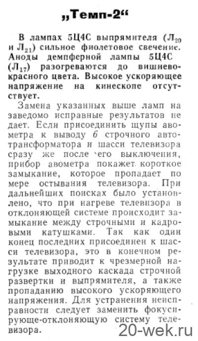 Телевизор ч/б изображения *Темп-2* с октября 1955 по декабрь 1956 года включительно выпускал Московский радиозавод. Телевизор второго класса **Темп-2** имеет ряд конструктивных и схемных особенностей по сравнению с телевизором **Темп**, но конструкция, оформление и все параметры остались прежними. Аппарат работает в любом из 5 каналов, принимает ЧМ радиостанции в трёх поддиапазонах, воспроизводит граммофонную и магнитную запись. Питание от сети 110, 127, 220 В. Собран он в деревянном полированном футляре размером 525х575х475 мм, имитированном под ценные породы дерева. Вес аппарата 44 кг. На передней панели под защитным стеклом расположен экран трубки 40ЛК1Б. Под экраном размещены четыре основные ручки управления. Справа футляра выведена сдвоенная ручка: наружная - настройки приёмника **подстройка** и внутренняя **переключатель поддиапазонов** служащие для настройки гетеродина и переключения каналов. Восемь вспомогательных ручек выведены на заднюю стенку. Две ручки регулировки линейности изображения и размера по горизонтали выведены на шасси под шлиц. Устанавливают эти регуляторы на заводе и заклеивают бумагой. При эксплуатации ими обычно не пользуются. Задняя часть аппарата закрыта съёмной стенкой с прорезями для доступа к гнёздам, переключателям и ручкам управления. На задней стенке укреплена колодка с шнуром сети, при её снятии - автоматически отключается питание. Для воспроизведения звука на отражательной доске с левой стороны футляра установлены два громкоговорителя. Телевизор рассчитан на соединение с антенной 300-омным симметричным кабелем КАТВ-300. Ввод антенны включается при помощи специальной антенной колодки СДН идущей в комплекте с ТВ. При наличии антенны с вводом из несимметричного 75-омного коаксиального кабеля PK-1 используется устройство СДН и гнездо с штеккером. Для приёма ЧМ используется ТВ антенна. Телевизор собран на 22 лампах. Чувствительность 250 мкВ. Потребляемая мощность 240 Вт, приёме радио 150 Вт. Радио №4/1965, ст.30