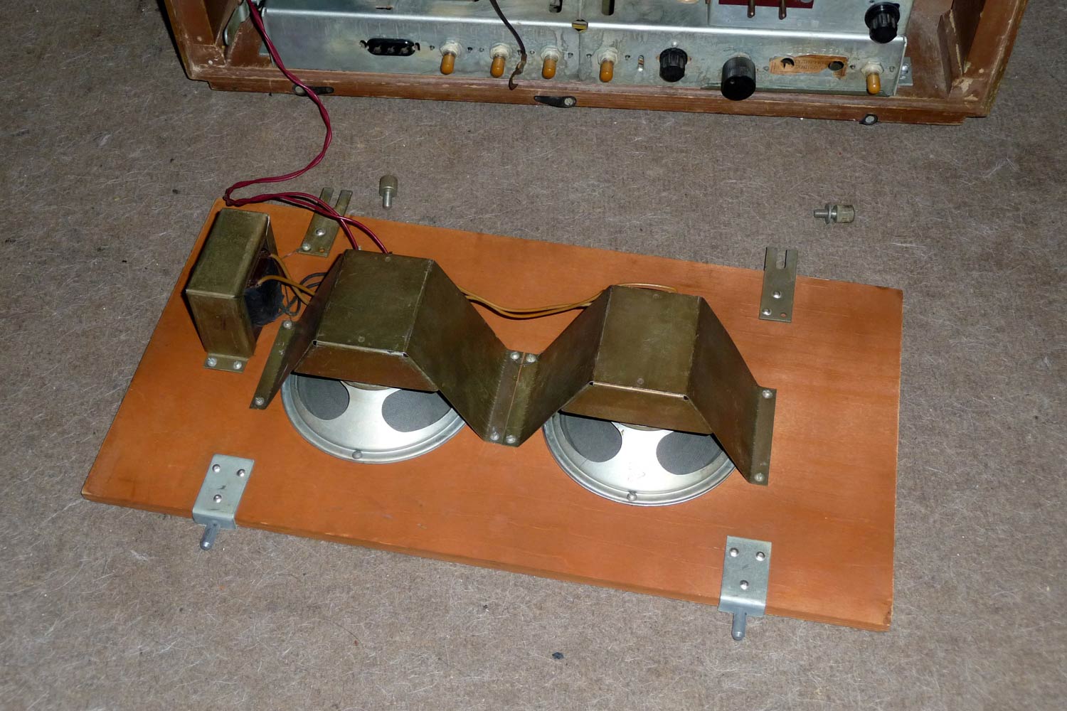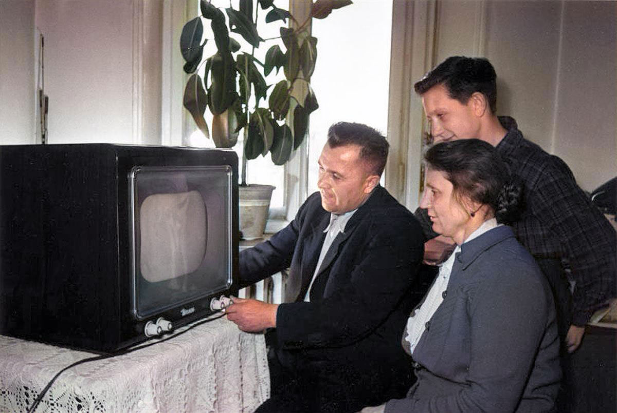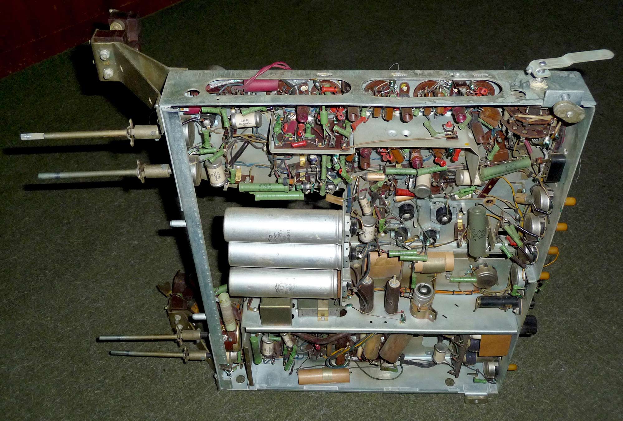 Телевизор ч/б изображения *Темп-2* с октября 1955 по декабрь 1956 года включительно выпускал Московский радиозавод. Телевизор второго класса **Темп-2** имеет ряд конструктивных и схемных особенностей по сравнению с телевизором **Темп**, но конструкция, оформление и все параметры остались прежними. Аппарат работает в любом из 5 каналов, принимает ЧМ радиостанции в трёх поддиапазонах, воспроизводит граммофонную и магнитную запись. Питание от сети 110, 127, 220 В. Собран он в деревянном полированном футляре размером 525х575х475 мм, имитированном под ценные породы дерева. Вес аппарата 44 кг. На передней панели под защитным стеклом расположен экран трубки 40ЛК1Б. Под экраном размещены четыре основные ручки управления. Справа футляра выведена сдвоенная ручка: наружная - настройки приёмника **подстройка** и внутренняя **переключатель поддиапазонов** служащие для настройки гетеродина и переключения каналов. Восемь вспомогательных ручек выведены на заднюю стенку. Две ручки регулировки линейности изображения и размера по горизонтали выведены на шасси под шлиц. Устанавливают эти регуляторы на заводе и заклеивают бумагой. При эксплуатации ими обычно не пользуются. Задняя часть аппарата закрыта съёмной стенкой с прорезями для доступа к гнёздам, переключателям и ручкам управления. На задней стенке укреплена колодка с шнуром сети, при её снятии - автоматически отключается питание. Для воспроизведения звука на отражательной доске с левой стороны футляра установлены два громкоговорителя. Телевизор рассчитан на соединение с антенной 300-омным симметричным кабелем КАТВ-300. Ввод антенны включается при помощи специальной антенной колодки СДН идущей в комплекте с ТВ. При наличии антенны с вводом из несимметричного 75-омного коаксиального кабеля PK-1 используется устройство СДН и гнездо с штеккером. Для приёма ЧМ используется ТВ антенна. Телевизор собран на 22 лампах. Чувствительность 250 мкВ. Потребляемая мощность 240 Вт, приёме радио 150 Вт. Радио №4/1965, ст.30