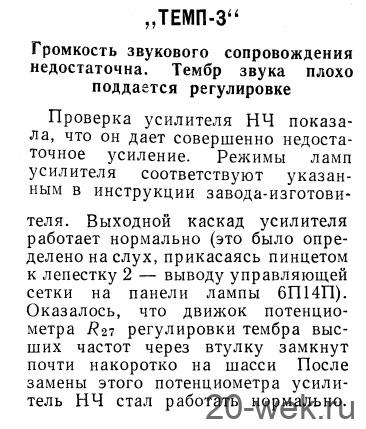 Телевизионный приёмник чёрно-белого изображения *Темп-3* с 1957 по 1960 год выпускал Московский радиозавод. Телевизор второго класса **Темп-3** является дальнейшей модернизацией моделей **Темп**. В телевизор внесены существенные изменения которые улучшили качество изображения и звука, удобство в эксплуатации. Телевизор работает в любом из 12-ти каналов. Кроме того, телевизор рассчитан на приём ЧМ станций в диапазоне 64,5...73 Мгц и для воспроизведения грамзаписи и записи звука на магнитофон. В телевизоре применено 18 ламп, прямоугольный кинескоп 43ЛК2Б, 13 диодов, что позволило сделать его экономичным. Питание от сети переменного тока, потребляемая мощность 165 при приёме ТВ и 65 Вт радио. При приёме слабых сигналов имеется возможность перехода на инерционную схему синхронизации делающую изображение более устойчивым и менее зависящим от помех. Для приёма на ЧМ в телевизоре имеется специальная внутренняя антенна. При включении ЧМ диапазона работают лишь 5 ламп. Чувствительность - 200 мкВ. Номинальная выходная мощность 2 Вт. ТВ смонтирован в деревянном полированном футляре размером 495х480х450 мм. Вес ТВ 32 кг. Экран закрыт съёмным небьющимся стеклом. Под экраном находятся сдвоенные ручки для управления, слева выключатель, яркость и контрастность, справа громкость и настройка ЧМ. Между ними - шкала. У телевизора было несколько оформлений. За всё время выпуска телевизор претерпел три модернизации схемы. Экспортный вариант телевизора *Темп-3* по оформлению схож с телевизором *Темп-4* выпускавшийся позднее. Опыт ремонта Радио№7/1964, ст. 28