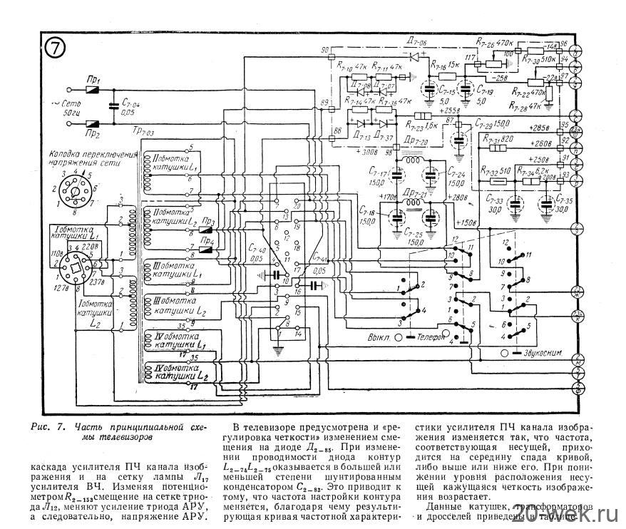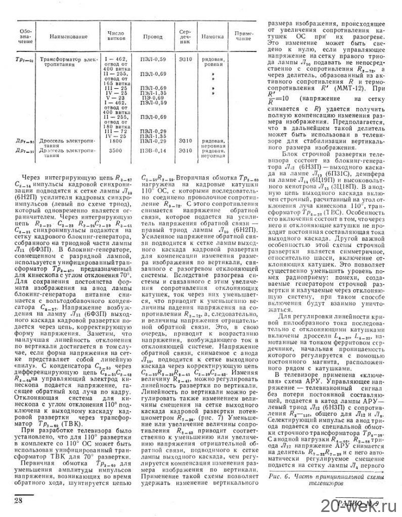 Телевизионные приёмники ч/б изображения *Темп-6* (С) и *Темп-7* (С) с 1960 года выпускал Московский радиозавод. Эти телевизоры воплотили в себе все последние достижения отечественной и зарубежной телевизионной техники начала шестидесятых. Они ни в чём не уступали лучшим зарубежным образцам, а по многим параметрам и превосходили их. Телевизоры созданы конструкторским бюро Московского радиозавода под руководством Д.С.Хейфеца. Модели представляют собой 17 ламповые 12 канальные телевизоры. Отличие в кинескопах и оформлении. В телевизоре **Темп-6** установлен кинескоп 43ЛК9Б с размером изображения 270х365 мм. В телевизоре **Темп-7** кинескоп 53ЛК6Б, с размером изображения 350х470 мм. Телевизоры имеют общую схему, конструкцию и характеристики. В телевизоре **Темп-7** за счёт большего футляра и улучшенной АС, где один громкоговоритель расположен в нижней части футляра, а другой сбоку, диапазон частот 80...8000 Гц, у телевизора **Темп-6** он 100...7000 Гц. В его АС также работают два громкоговорителя, но они находятся спереди. Номинальная выходная мощность 1 Вт. Чувствительность 100 мкВ. Такая чувствительность в сочетании с АПЧ и Ф и АРУ позволяет получить уверенный приём программ на наружную антенну в радиусе до 70 км. Потребляемая мощность 200 Вт. Имеется возможность подключения головных телефонов и звукоснимателя. Предусмотрен ППДУ для управления яркостью изображения и громкостью звука (в комплект не входит). Футляры деревянные, фанерованы ценными породами дерева. Габариты модели **Темп-6** - 444х562х338 мм. Вес 28 кг. Цена 336 рублей. Габариты телевизора **Темп-7** - 544х610х442 мм. Вес 43 кг. Цена 480 рублей. Телевизоры экспортировались в страны Европы (индекс Е) и Америки (индекс А). За годы производства (1960...1964) телевизоров **Темп-6** было изготовлено 320.000 экземпляров, **Темп-7** 13.500 экземпляров. С 1962 года Шауляйский телевизионный завод так же выпускал телевизор **Темп-6**. В конце 1964 года телевизор **Темп-7** модернизирован в модель **Темп-7Б**, но сведений об этом не нашлось. Описание и схема Радио №9/1961 ст. 24 Опыт ремонта Радио №7/1964, ст.29 Опыт ремонта Радио №12/1964, ст.29 Радио №11/1965, ст.33 Радио №1/1966, ст.28