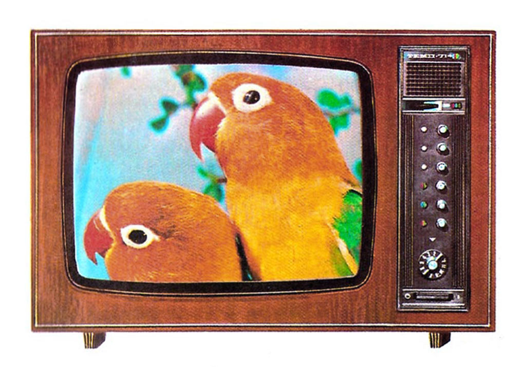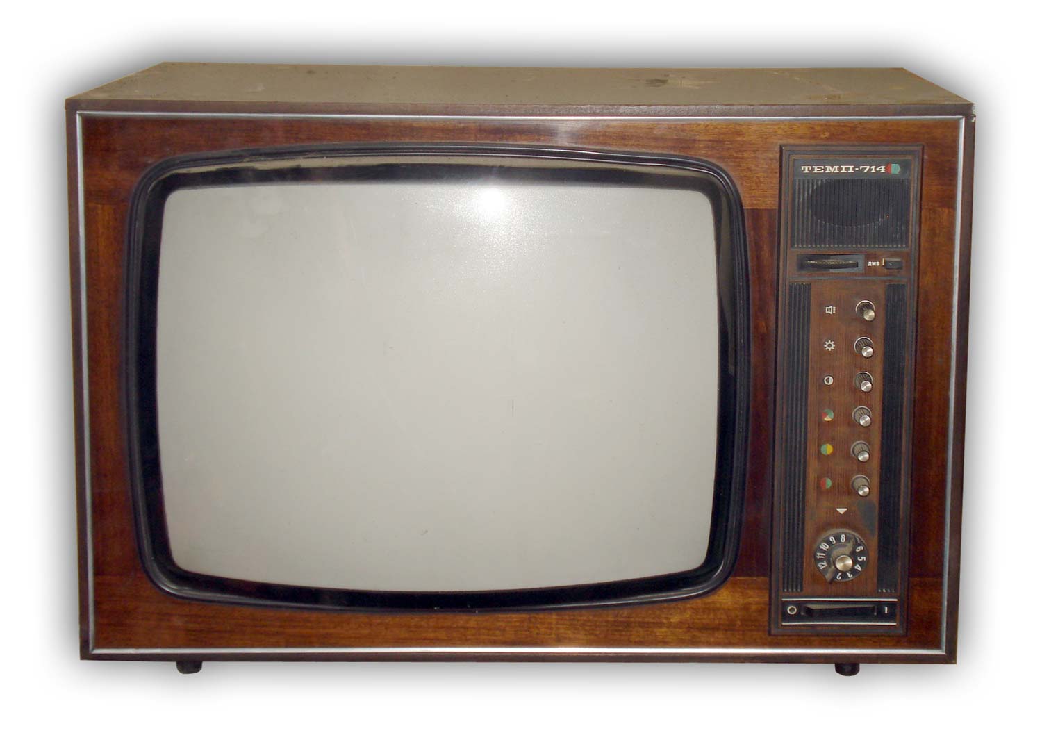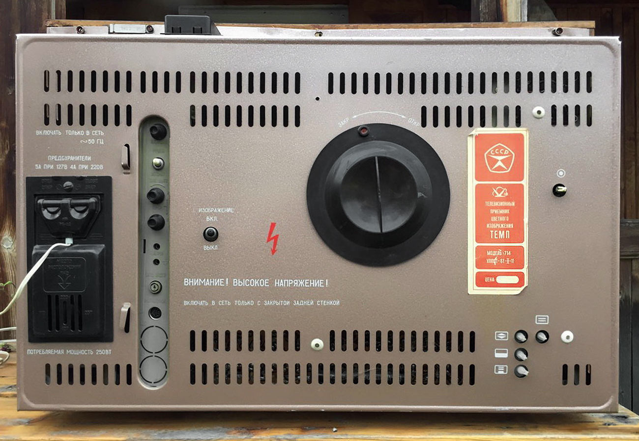 Телевизионный приёмник цветного изображения *Темп-714* (тип УЛПЦТ-61-II-11) с 1977 года выпускал Московский радиозавод. **Темп-714** - это унифицированный лампово-полупроводниковый цветной телевизор 2-го класса на кинескопе 61ЛК3Ц. Он обеспечивает приём телевизионных передач ч/б и цветного изображения в зоне уверенного приёма телевизионного центра или ретрансляционной станции на любом из 12 каналов МВ. При установке селектора каналов СК-Д-1 и на любом из каналов ДМВ диапазона. В телевизоре предусмотрены: возможность подключения магнитофона на запись звукового сопровождения передач; прослушивание звукового сопровождения головными телефонами с отключенными громкоговорителями в АС ТВ. Телевизор обладают высокой чувствительностью и эффективно действующей схемой АРУ. Повышению качества принимаемого изображения способствует наличие АПЧГ, исключая необходимость подстройки при переключении каналов. Размер изображения 362x482 мм. Чувствительность 50 мВ. Разрешающая способность совмещённого чёрно-белого изображения 450 линий. Номинальная выходная мощность канала звука 2,3 Вт. Диапазон воспроизводимых частот 80...12500 Гц. Звук воспроизводится громкоговорителями 2ГД-36 и ЗГД-38Е. Потребляемая от сети мощность 250 Вт. В телевизоре используются 7 радиоламп, 47 транзисторов и 70 полупроводниковых диодов. Габариты телевизора 550x773x540 мм. Масса 60 кг. С 1978 года завод выпускал телевизор *Темп-718* практически не отличающийся от описанного выше.
