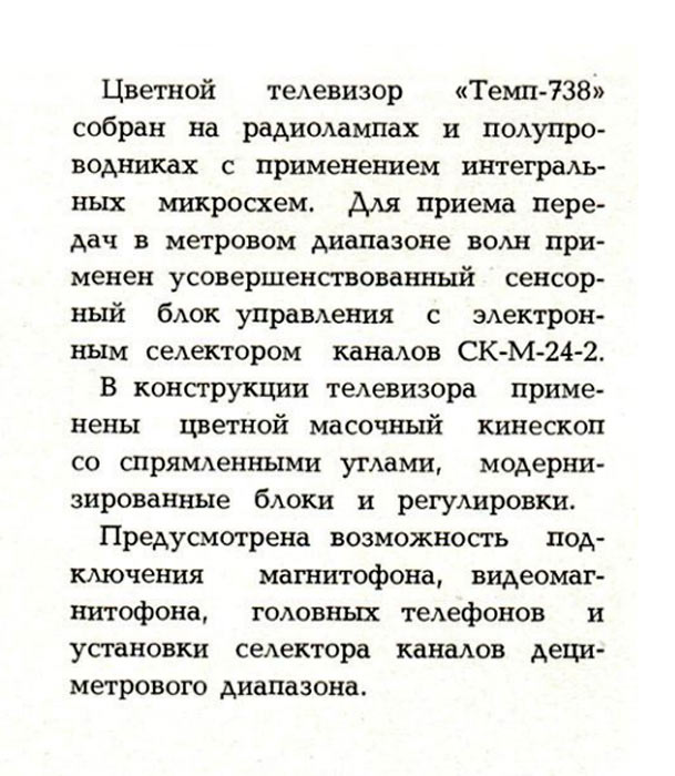 Цветной телевизор *Темп-738* с 1984 года выпускал Московский радиозавод *Темп*. *Темп-738* это унифицированный лампово-полупроводниковый телевизор для приёма программ цветного изображения в диапазоне МВ. Есть возможность установки блока СКД-22, после чего он может работать и в диапазоне ДМВ. Размер изображения 480 х 360 мм. Чувствительность 55 мкВ. Разрешающая способность 450 линий. Номинальная выходная мощность 2,3 Вт. Диапазон воспроизводимых частот 80...12500 Гц. Потребляемая мощность 250 Вт. Габариты модели 790 х 550 х 540 мм. Вес 60 кг.
