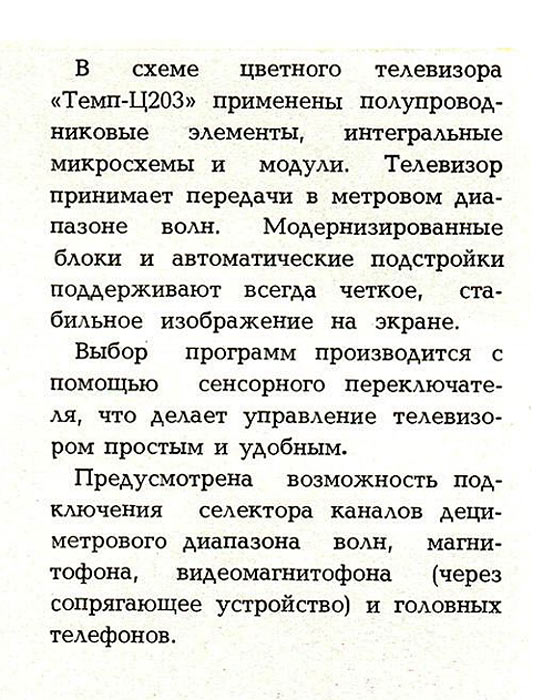 Телевизионный приёмник цветного изображения *Темп Ц-203* в 1984 году ограниченной серией выпустил *Московский радиозавод*. Телевизор 2-го класса **Темп Ц-203** (УПИМЦТ-61) представляет собой безламповый аппарат, в котором применены микросхемы и модули. Для перехода с одной программы на другую, достаточно нажатия на сенсорную кнопку. Телевизор работает в МВ и ДМВ диапазонах. Качество изображения гарантируют автоматические регулировки. В телевизоре предусмотрено подключение видеомагнитофона, магнитофона для записи звукового сопровождения программ, диагноз-тестера для выявления дефектов в схеме. Размер изображения 482 х 362 мм. Чувствительность в диапазоне МВ - 80 мкВ, ДМВ - 150 мкВ. Полоса воспроизводимых звуковых частот 100...10.000 Гц. Номинальная выходная мощность канала звука 2,5 Вт. Напряжение питания 170... 240 В. Потребляемая мощность 185 Вт. Размеры телевизора 750 х 550 х 520 мм. Масса 51 кг.