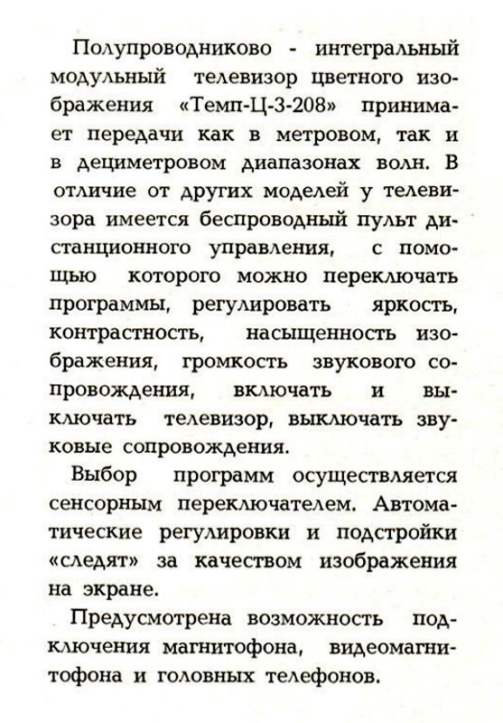 Цветной телевизор *Темп Ц3-208* планировался к выпуску с 1984 года Московским радиозаводом *Темп*. Каталог *Товары народного потребления* за 1984 год.