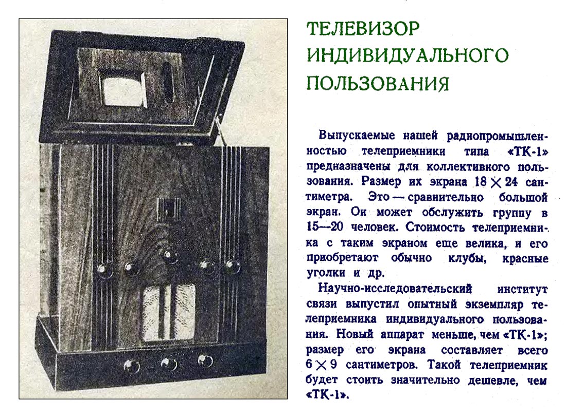Телевизор *ТИ-1* разработан в конце 1937 года инж. А.А.Расплетиными в НИИС и собран в количестве нескольких экземпляров центральным НИИ связи в Москве. Телевизор Индивидуальный *ТИ-1* по габаритам сравним с радиоприёмником *СИ-235*. Как выяснилось в процессе экспериментов телевизор оказался неприспособленным для массового производства из-за нестабильности строчной и кадровой развёрток, плохой чувствительности и др. В 1938 году схема телевизора была доработана, устранены недостатки и под наименованием *ТИ-2* было выпущено так же только несколько образцов. В течении 1939 года был разработан наиболее совершенный телевизор *ТИ-3*, который мог принимать программы телевидения с числом строк изображения от 240 до 441 на кинескопе диаметром 17 сантиметров. Телевизор мог принимать и программы радиовещания в диапазоне от 15 до 2000 метров. После выпуска опытных экземпляров и испытаний телевизор *ТИ-3* был намечен для серийного производства и начал с 1940 года выпускаться на Ленинградском заводе *Радист* и частично на заводе Козицкого под наименованием *17ТН-1*. Внизу описание телевизора в журналах *Техника Молодёжи № 3 за 1938 год и *Техника Молодёжи № 7-8 за 1939 год.