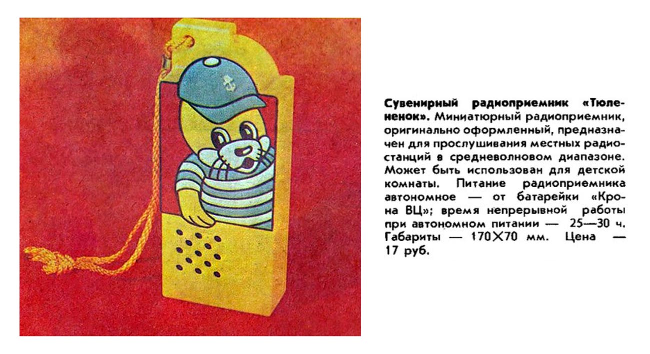 Сувенирный радиоприёмник *Тюленёнок* выпускал с 1980 года *Таллинский Электротехнический завод имени Ханса Пегельмана*. Выпуск приурочен к Олимпийским играм 1980 года в Москве. Приёмник предназначен для прослушивания радиовещательных станций в диапазоне СВ. Чувствительность приёмника 10 мВ/м. Селективность 12 дБ. Диапазон воспроизводимых звуковых частот 450...2700 Гц. Номинальная выходная мощность 60 мВт. Питание от батареи Крона ВЦ. Время непрерывной работы от новой батареи не менее 25 часов. Габариты модели 170х70х22 мм. Масса - 270 гр. Цена 17 рублей.