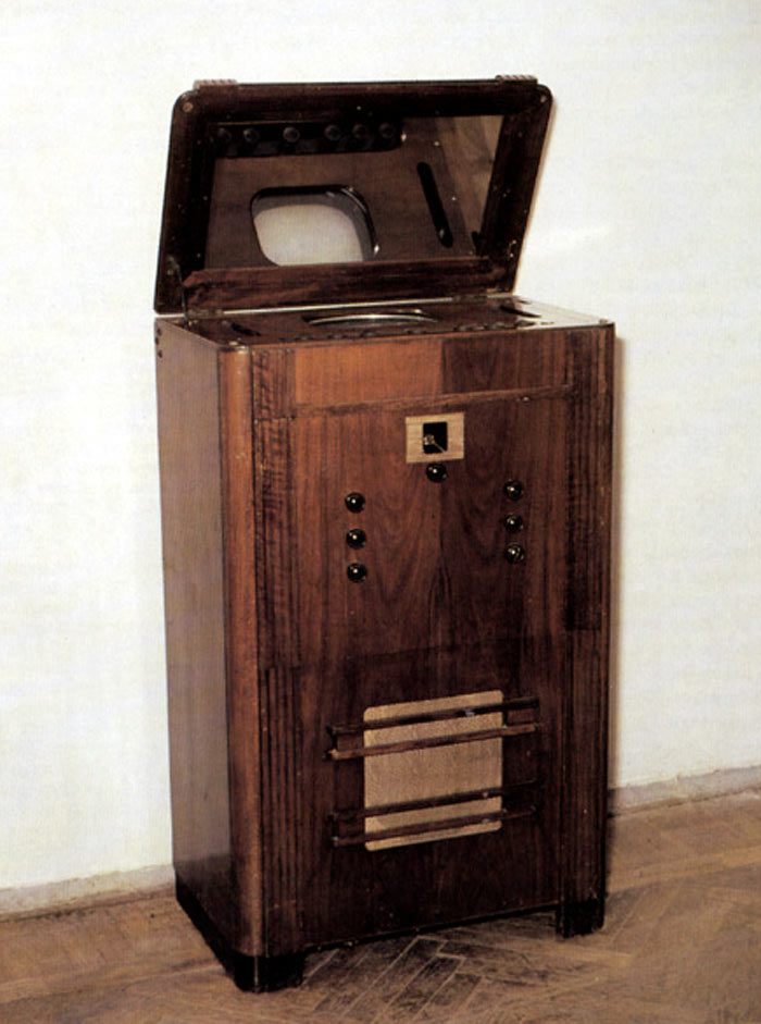 Телевизионный приёмник чёрно-белого изображения *ТК-1* с осени 1938 года выпускал Ленинградский завод имени Козицкого. В сентябре 1937 года была организована первая в СССР публичная демонстрация высококачественного электронного телевидения. А уже в октябре 1938 года был запущен в опытную эксплуатацию Московский телевизионный центр на 343 строки (25 Гц), оборудованный аппаратурой из США. Первым телевизором, рассчитанным на приём МТЦ, был консольный телевизор *ТК-1* разработанный по документации и образцам США, где подобные телевизоры выпускали с 1934 года. В телевизоре было 33 радиолампы и круглый кинескоп 22-ЭЛПТ-1 с длиной горловины в метр, отчего расположен он был вертикально а зеленоватое изображение (цвет свечения люминофора) размером 14х18 см проецировалось зрителю посредством зеркала вмонтированного в верхнюю крышку приёмника и открываемой на угол 45 градусов. Телевизор выпускали до 1941 года постоянно усовершенствуя, чаще в сторону упрощения. Большинство деталей и узлов к телевизору поставлялось из США. Настройка и испытания телевизоров представляли достаточные трудности и требовали высокой квалификации инженеров и сборщиков. Всего заводом было выпущено около 6 тысяч телевизоров. Все они разошлись по лабораториям для изучения процесса приёма телевидения, по различным учереждениям, а небольшая часть была выставлена в свободную продажу и куплена состоятельными гражданами СССР.