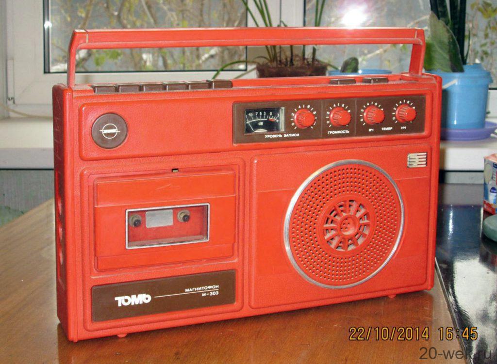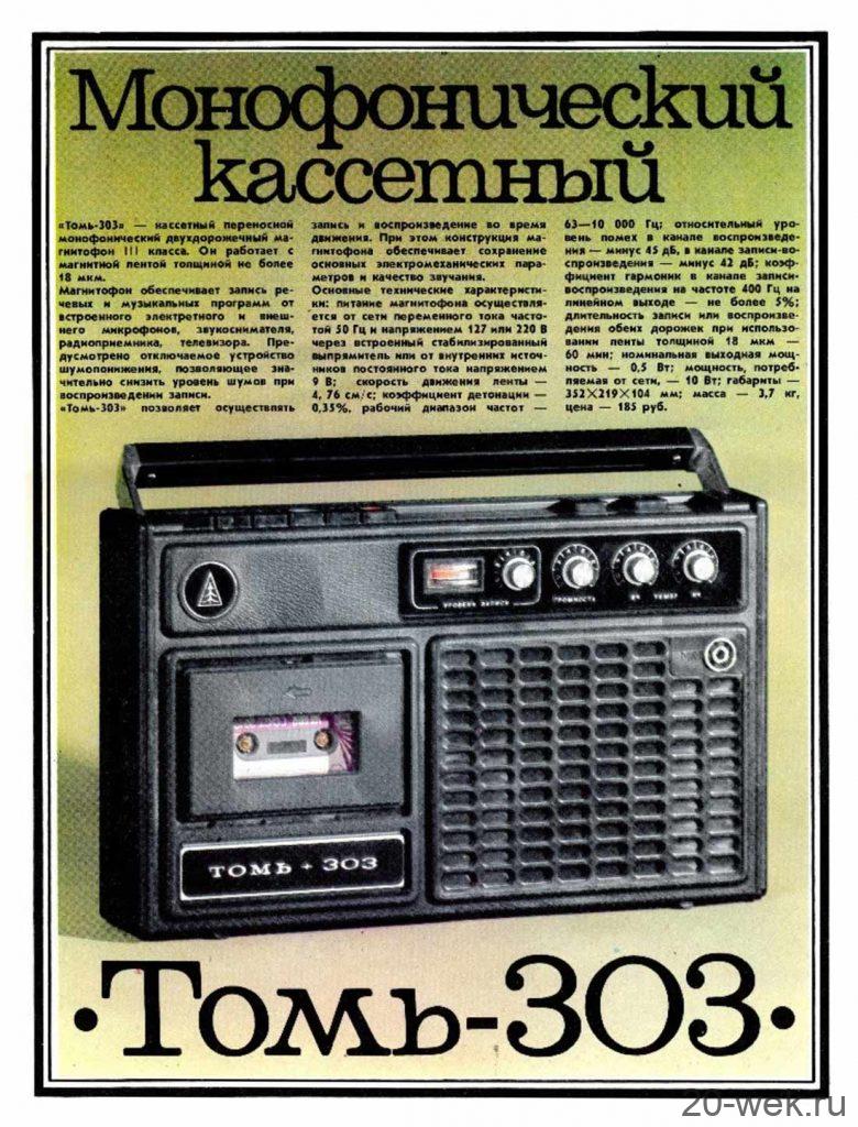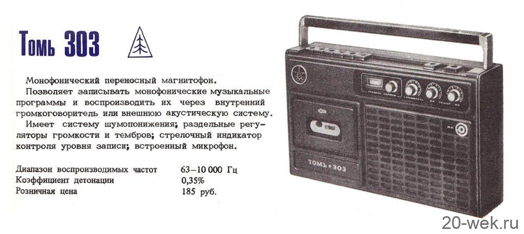Портативный магнитофон "Томь-303" с 1981 года выпускал Томский радиотехнический завод. Магнитофон предназначен для записи фонограмм с микрофона и внешних источников сигнала и их воспроизведение. Магнитофон позволяет осуществлять запись или воспроизведение и во время движения, обеспечивая основные параметры. Имеется отключаемое устройство СШП при воспроизведении. Питание МГ осуществляется от сети, через встроенный блок питания или от 6 элементов А-343. Коэффициент детонации ±0,35%. Рабочий диапазон частот звука на ЛВ - 63...10000 Гц. Относительный уровень шумов и помех канала З/В -48 дБ. Коэффициент гармоник 4%. Номинальная выходная мощность 0,5, максимальная 1,5 Вт. Потребляемая от сети мощность 10 Вт. Габариты аппарата - 352 х 219 х 104 мм. Масса - 4 кг. С 1987 года завод выпускал магнитофоны ''Томь М-303'' с таким же и другим оформлением передней панели и разнообразной цветовой гаммой футляров