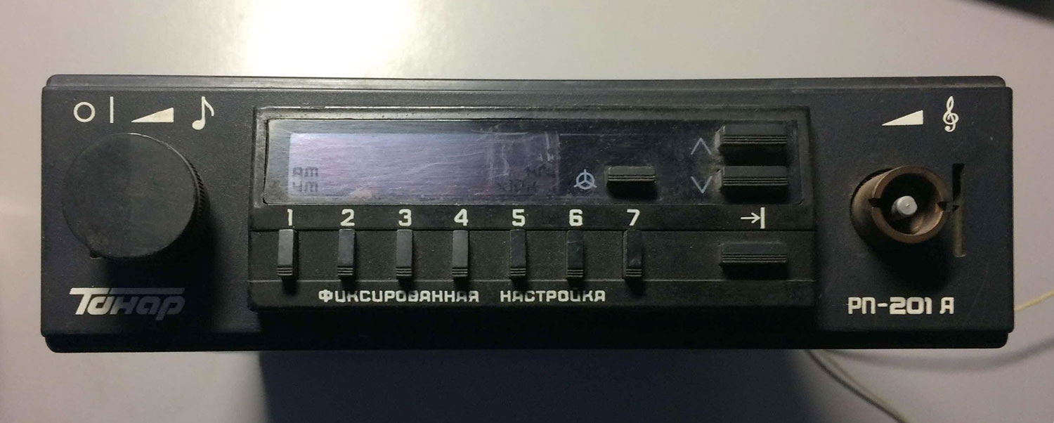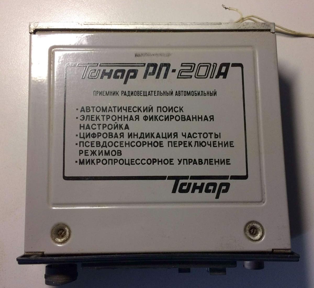 Радиоприёмник автомобильный *Тонар РП-201А* с 1990 года выпускал Молодечненский завод *Спутник*. Устанавливается в автомобили ВАЗ, работает в диапазонах ДВ, СВ и УКВ на автомобильную антенну АР-108. Переключение диапазонов электронное, фиксированная настройку на 14 станций, регулировка тембра ВЧ. Питание от бортовой сети. Чувствительность 3 мкВ. Номинальная выходная мощность 3, максимальная 7 Вт. Потребляемый ток от 50 до 350 мА. Габариты модели 180 х 165 х 52 мм. Масса (без АС) 1,4 кг. Цена 190 рублей.