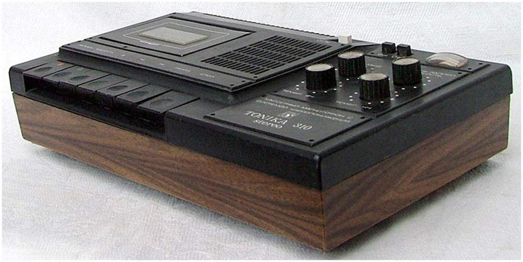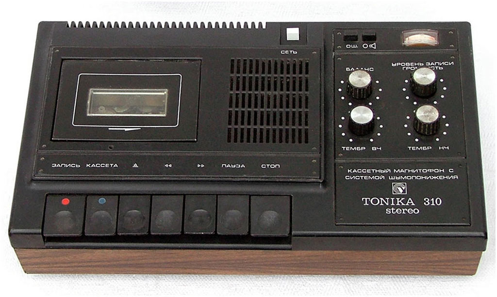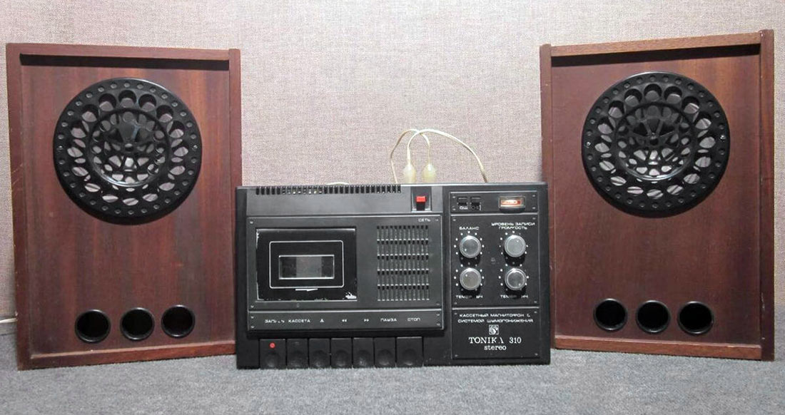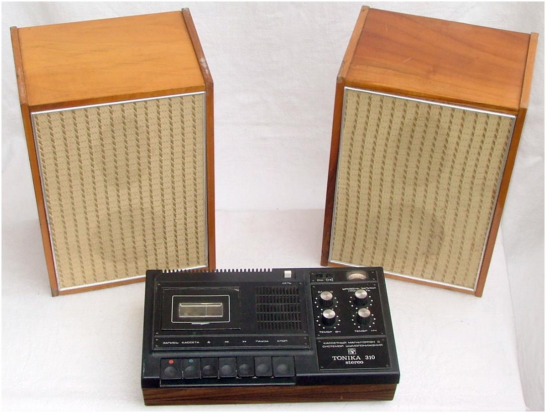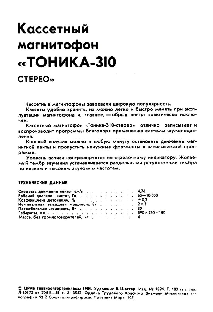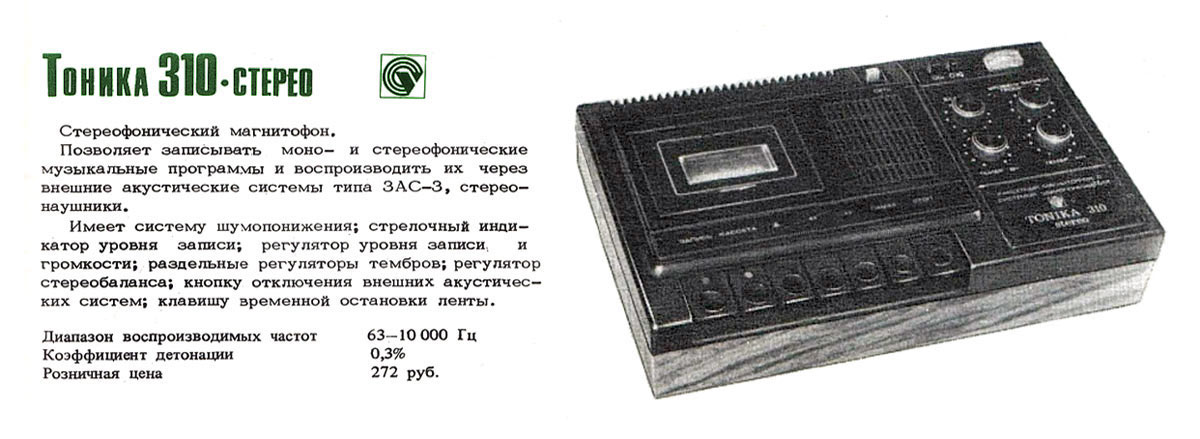 Кассетный стереофонический магнитофон *Тоника-310 стерео* с 1976 года выпускал Вильнюсский ПСЗ *Вильма*. Аппарат предназначен для записи и воспроизведения фонограмм и последующего их воспроизведения. Работает магнитофон с двумя АС, в каждой из которых стоит по одному громкоговорителю 3ГД-38Е. В магнитофоне имеется отключаемая система шумоподавления, стрелочный индикатор уровня записи, он выставляется в левом канале, затем добавляется уровень правого и с его превышением, регулятором правого канала уменьшают уровень до прежнего. Есть регулировка тембра ВЧ и НЧ, гнездо стереотелефонов с отключением АС и без. ЛПМ собран по на двигателе-трансформаторе. Корпус магнитофона полистироловый, декорированный дюралевыми пластинами, ручками из металла с имитацией нижней части футляра под ценные породы дерева. Коэффициент детонации ± 0,3%. Максимальная выходная мощность 2х2,5 Вт. Среднее звуковое давление 2х0,6 Па. Диапазон рабочих частот на ЛВ - 63...10000 Гц. Потребляемая мощность 30 Вт. Габариты магнитофона 360х210х100 мм. Масса с АС 4,5 кг.