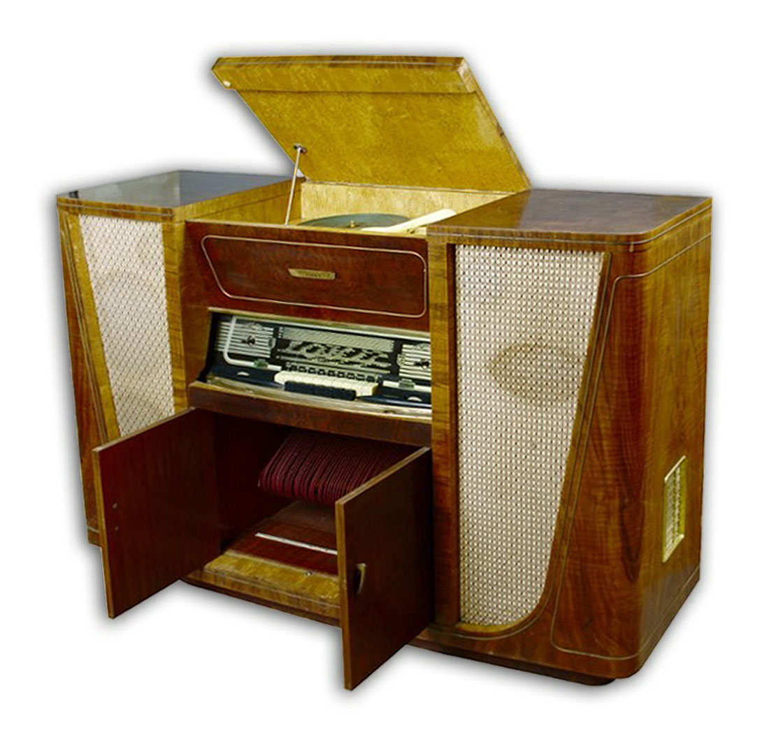 Радиола *Топаз* в 1958 года разработана Рижским Государственным электротехническим заводом ВЭФ. Радиола имеет двухканальный усилитель мощности звука (отдельно для НЧ и ВЧ), который нагружен акустикой, состоящей из семи динамиков, расположенных в трёх направлениях. По фронту расположены два низкочастотных громкоговорителя 5ГД-10, среднечастотный 3ГД-7 и два высокочастотных ВГД-1. По бокам каждого акустического отделения находятся ещё по одному ВГД-1. Радиола высшего класса построена на 15 лампах, приёмник имеет автоподстройку. Клавиши управления расположены в двух рядах, ближе к шкале: клавиши переключения диапазонов, включения/выключения питания, включения проигрывателя. Дальше от шкалы размещены клавиши тон-регистра и клавиши управления автоподстройкой. Радиола состоит из отдельных блоков и оснащена дистанционном управлением. Под шасси радиолы встроен шкаф для хранения грампластинок. В радиоле имеется встроенная магнитная антенна, а также диполь УКВ. Диапазоны частот: ДВ 150...415 кГц, СВ 520...1600 кГц, КВ1 - 11,49...12,14 МГц, КВ2 - 9,36...9,87 МГц, КВ3 - 6,94...7,35 МГц, КВ4 - 5,89...6,3 МГц, УКВ европейский - 87,5...100 МГц. Номинальная выходная мощность НЧ канала 4 Вт, ВЧ канала 3 Вт. Полоса воспроизводимых звуковых частот в диапазонах ДВ, СВ, КВ от 40 до 6500 Гц, в диапазоне УКВ от 40 до 15000 Гц, в режиме воспроизведения грамзаписи 50...10000 Гц. Потребляемая мощность 130 (140) Вт. Масса радиолы 80 кг.